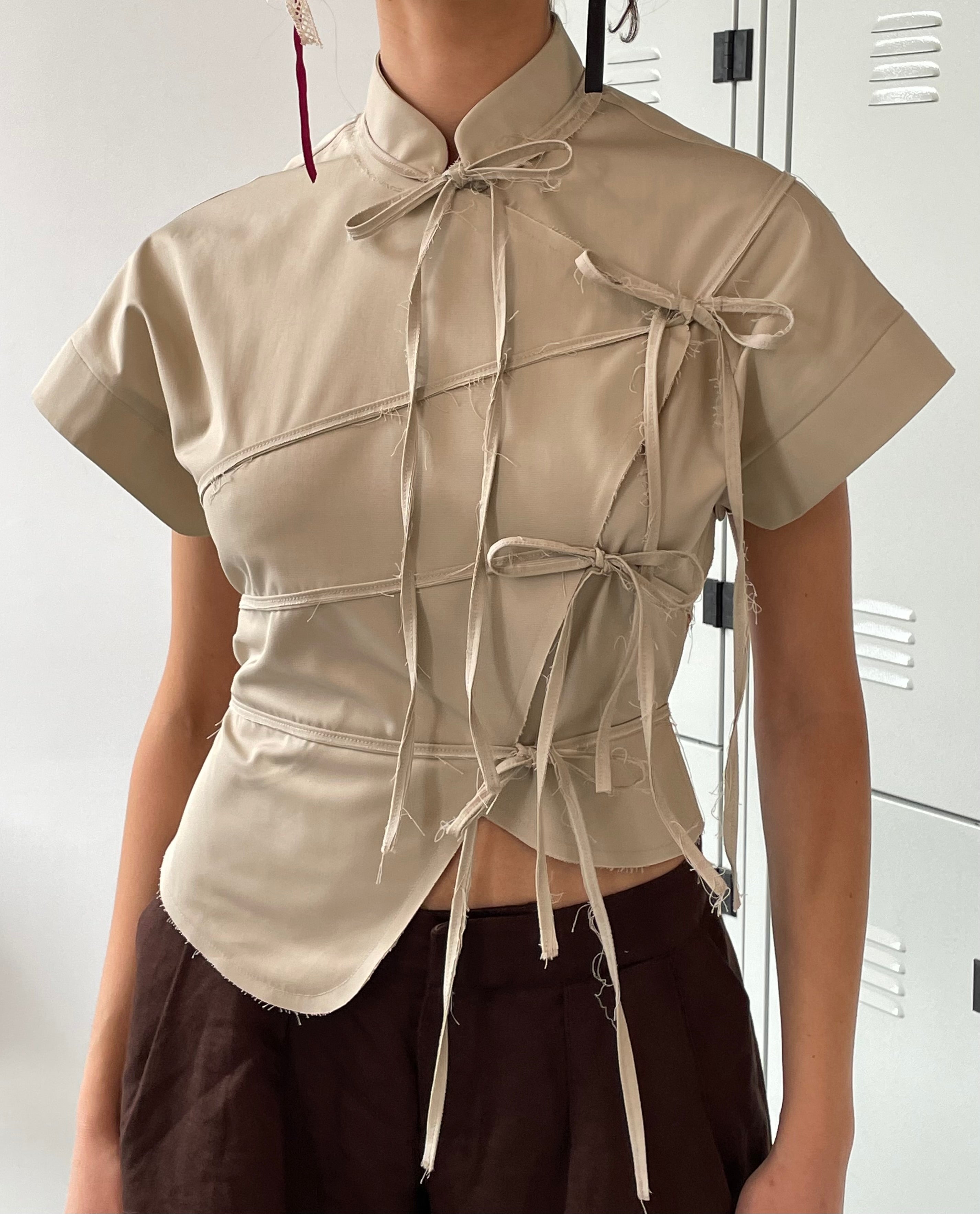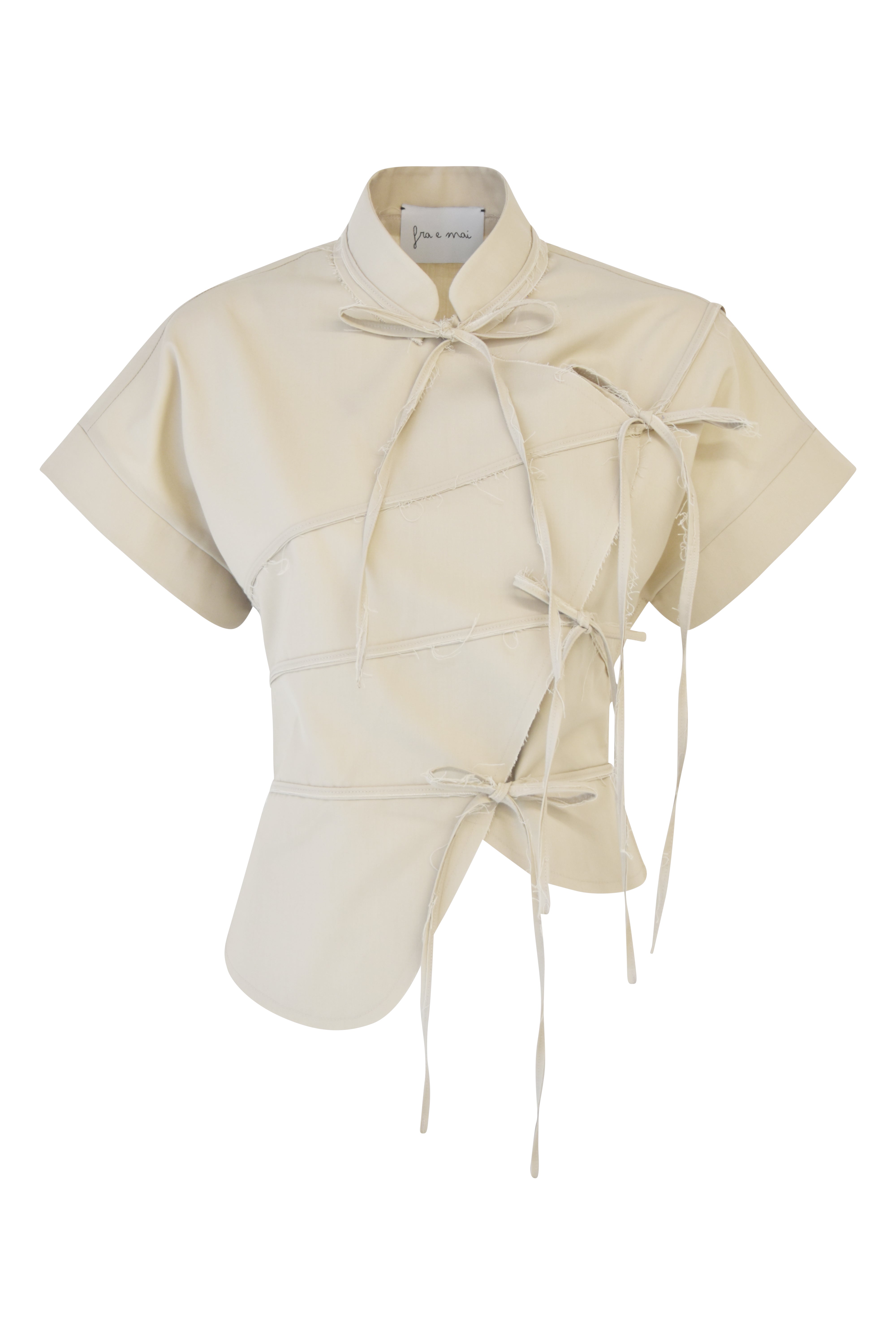 This is a modern backless wrap top with an asymmetrical silhouette and delicate tie closures. Made from lightweight fabric, it features a Mandarin collar and raw-edge detailing for a relaxed, deconstructed look. Perfect for layering over other tops or wearing solo as a statement piece.