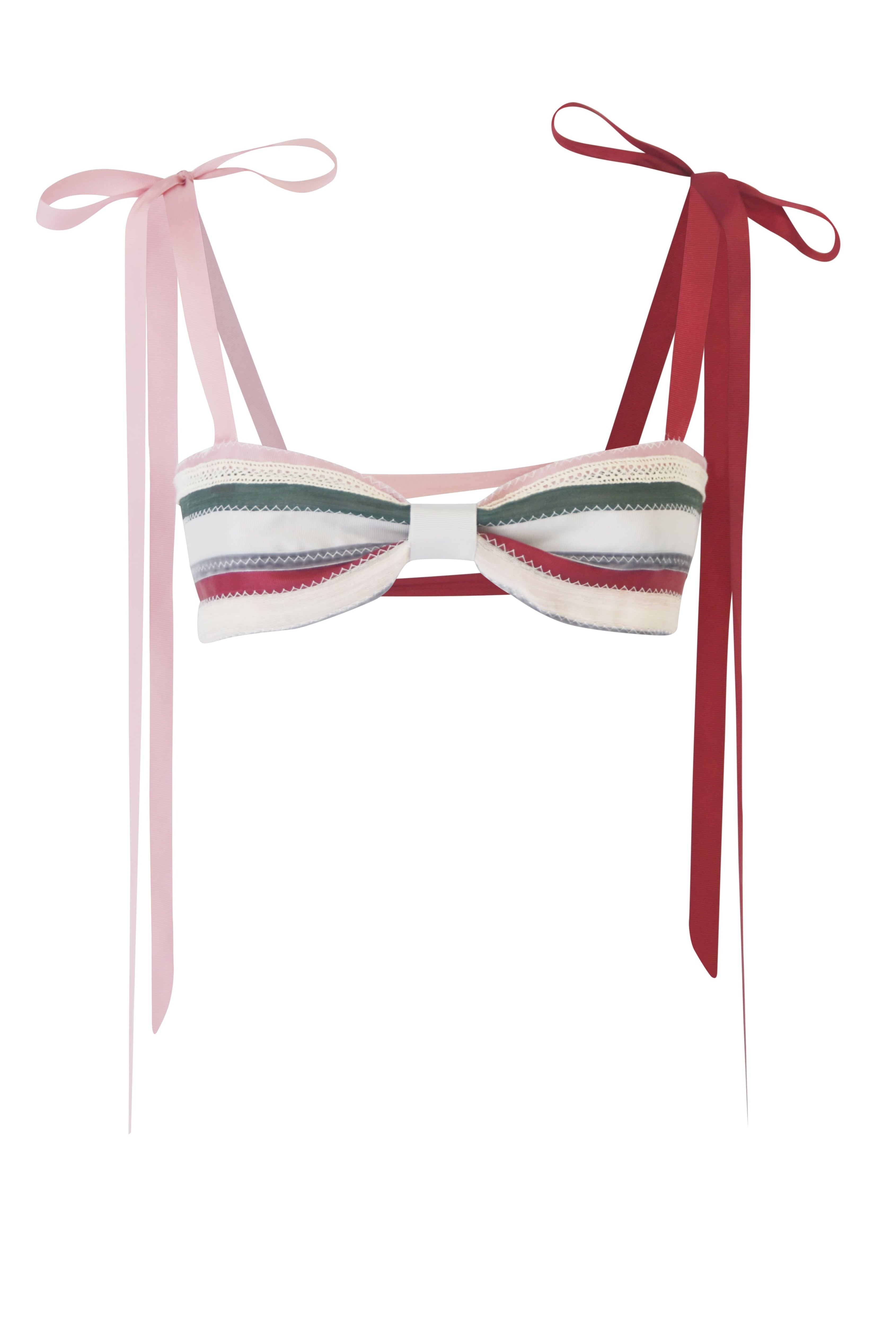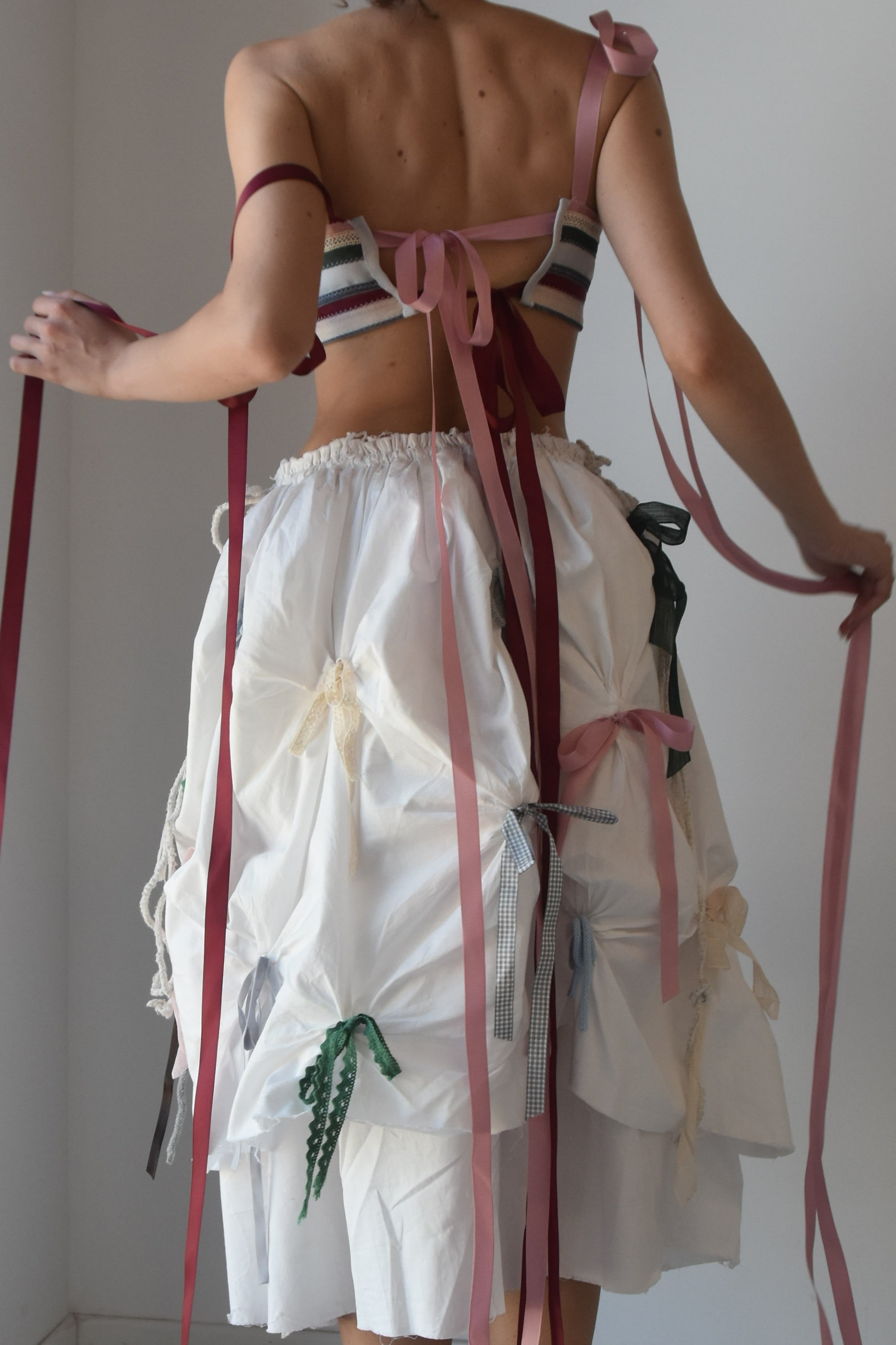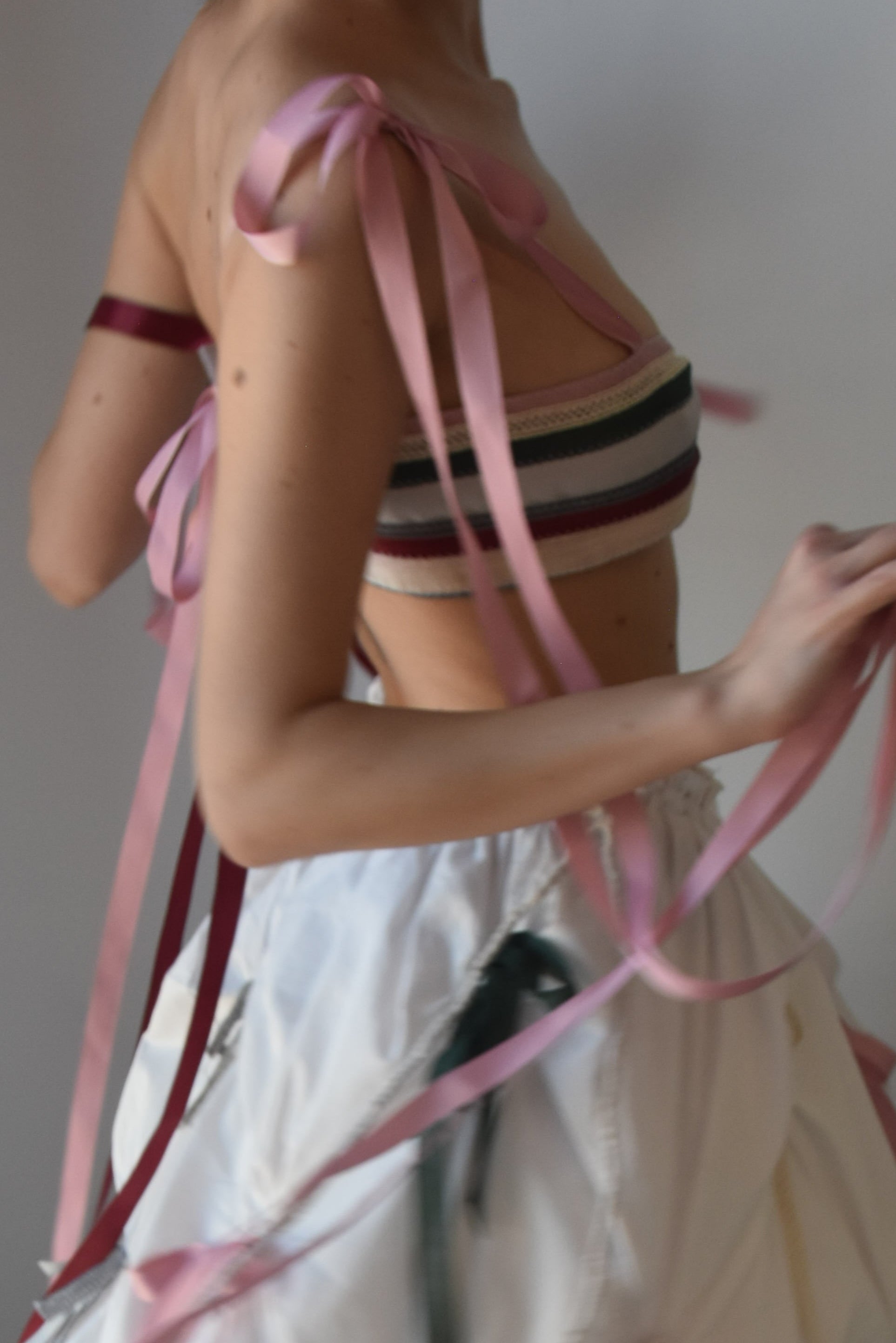 Handmade bow top crafted from 25 carefully selected leftover ribbons. Lightweight and adjustable, it blends upcycled materials with a playful, feminine aesthetic. Features multicolored horizontal ribbon detailing and an open back with contrasting shoulder ties in pink and burgundy for an asymmetrical finish.