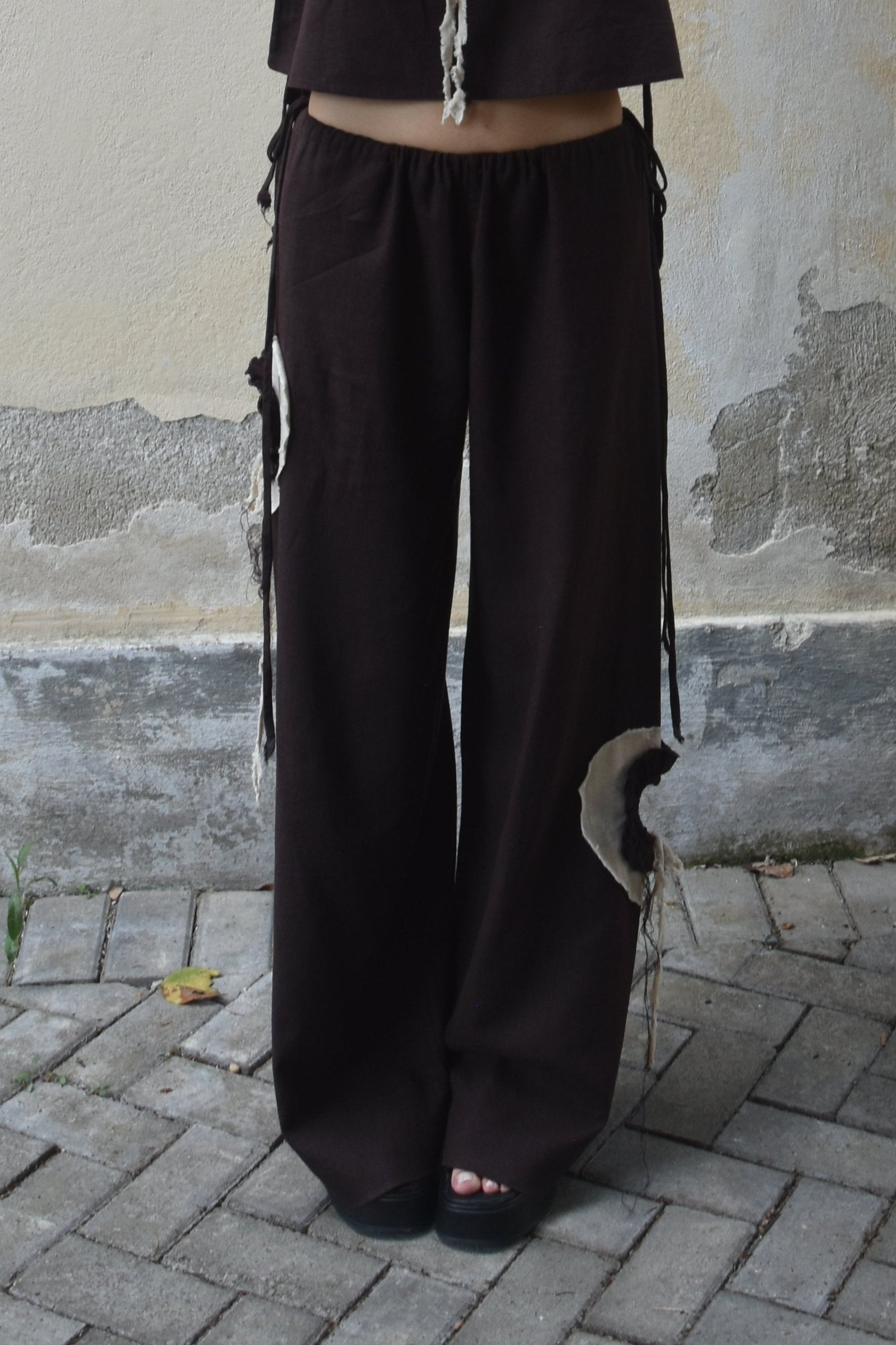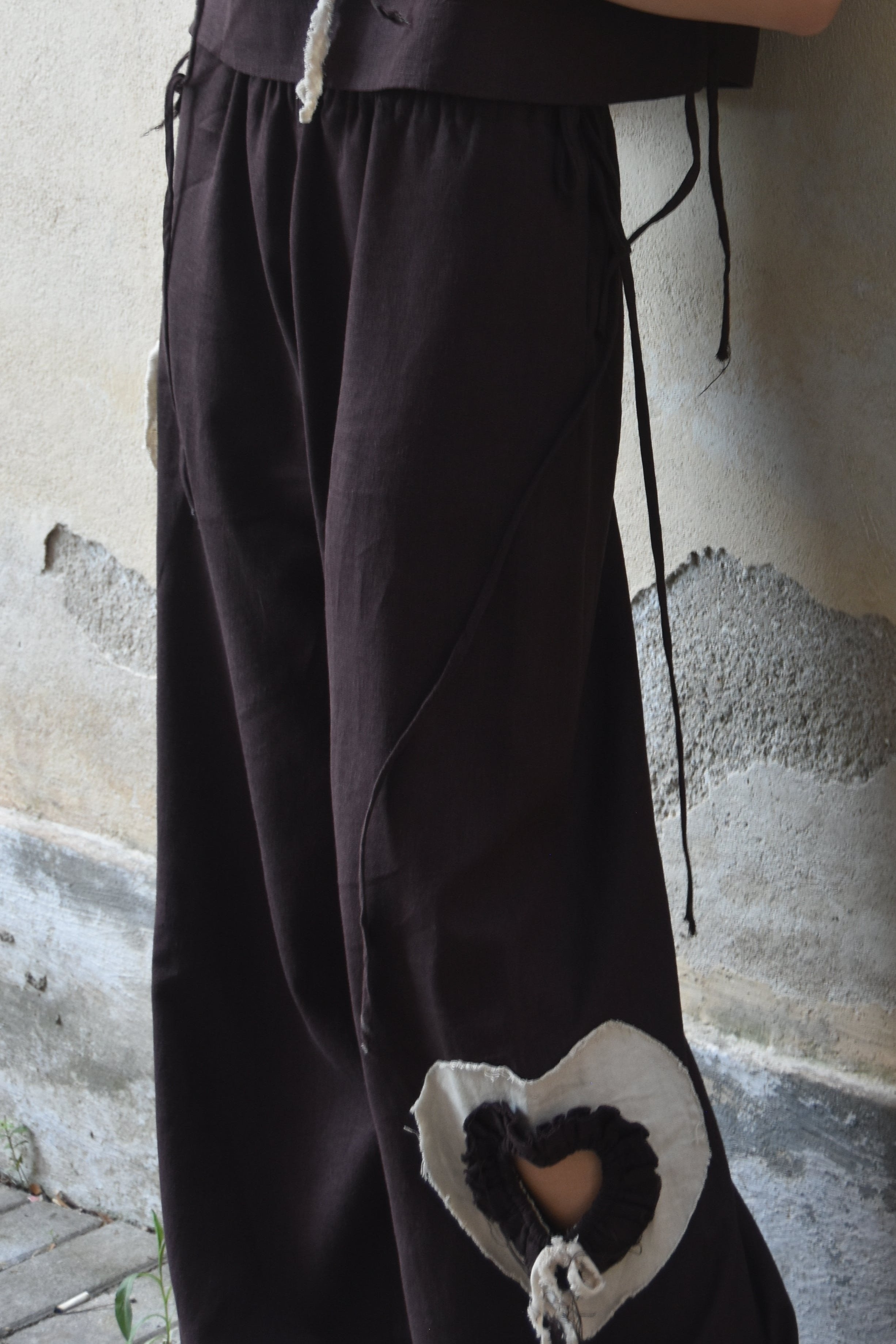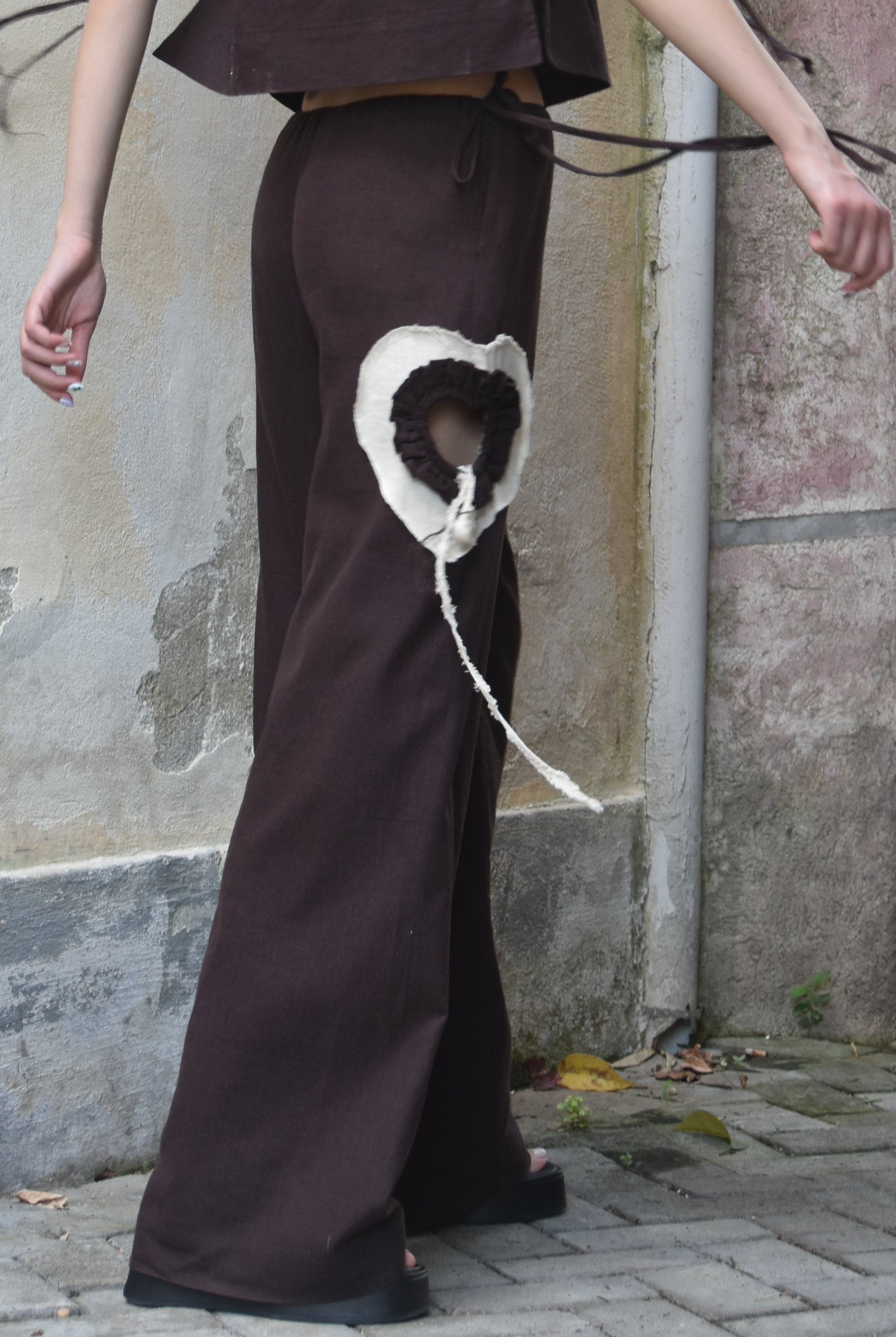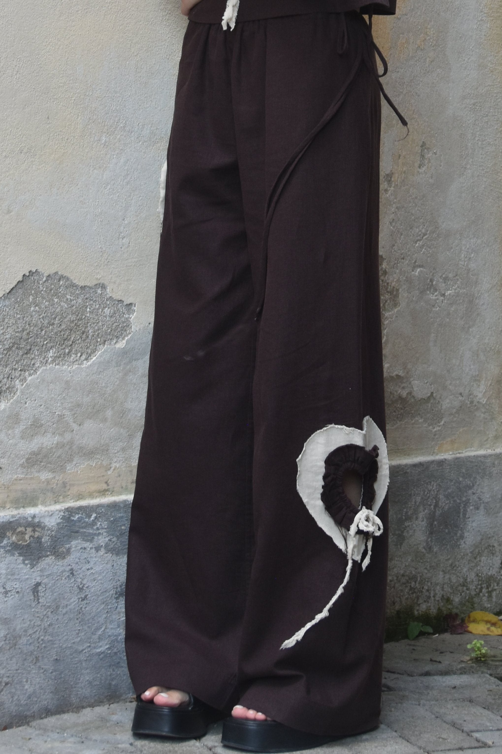 Linen chocolate brown wide-leg trousers featuring cut-out cream hearts on the sides, finished with ruffle details for a soft, deconstructed touch.
