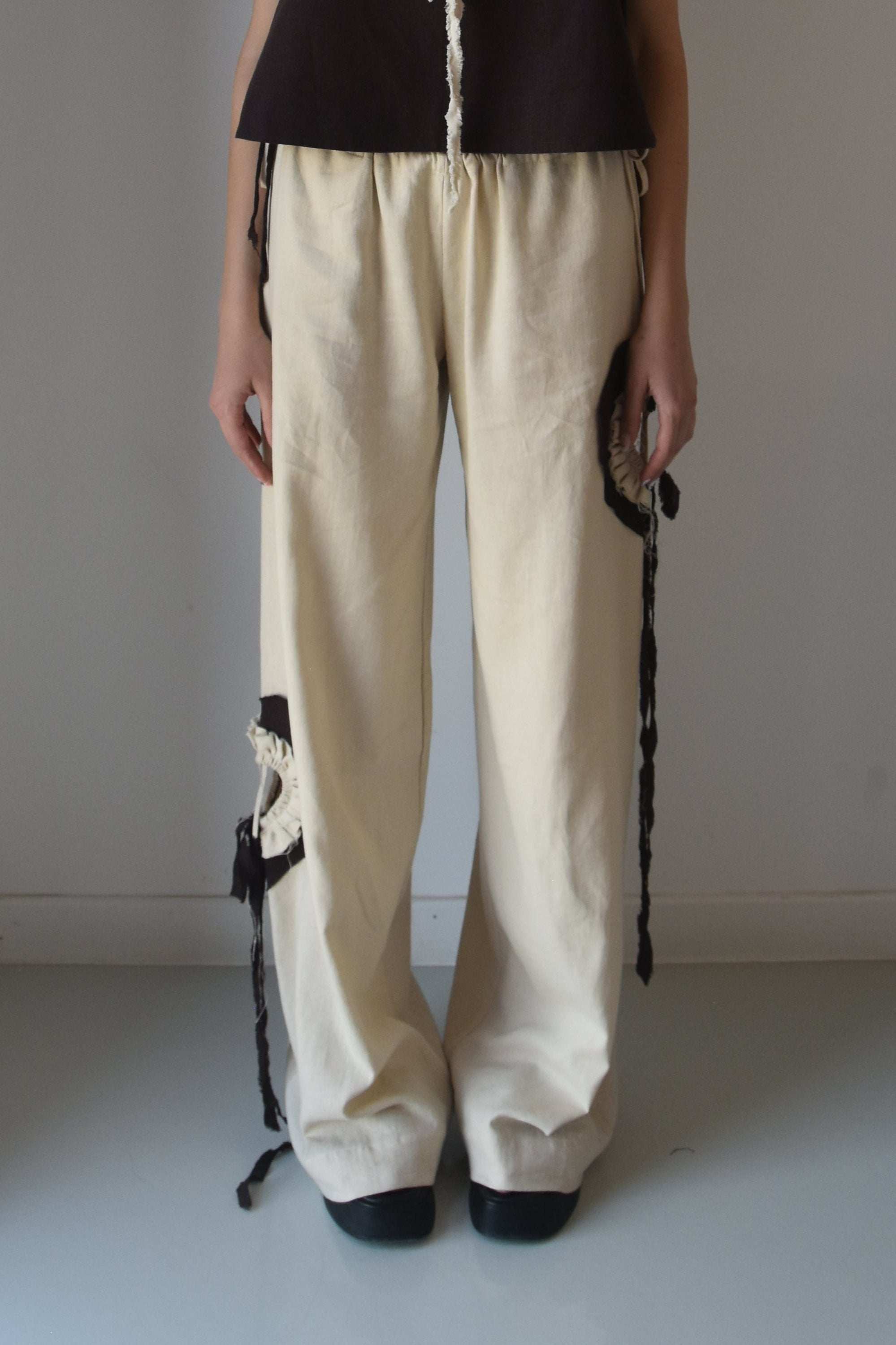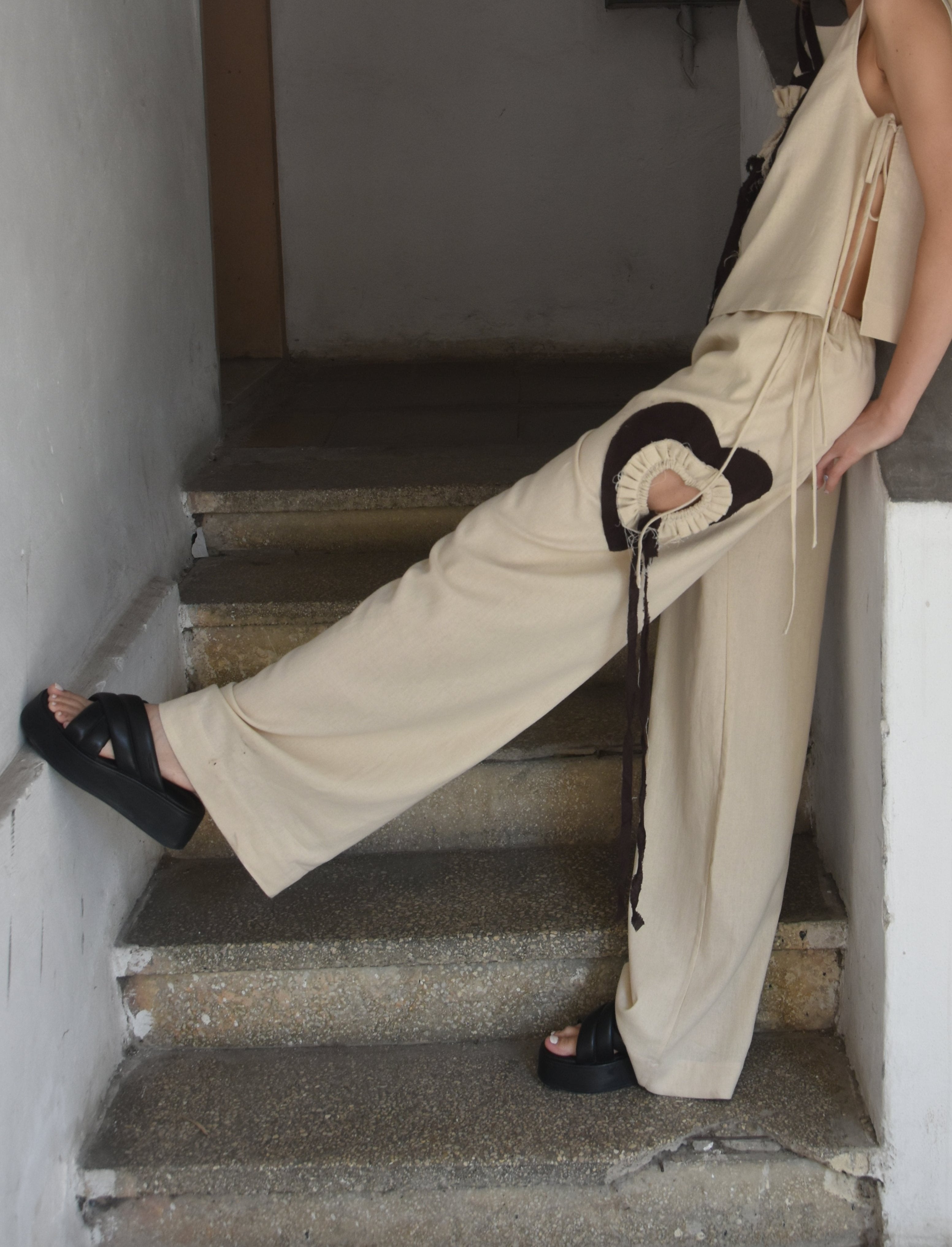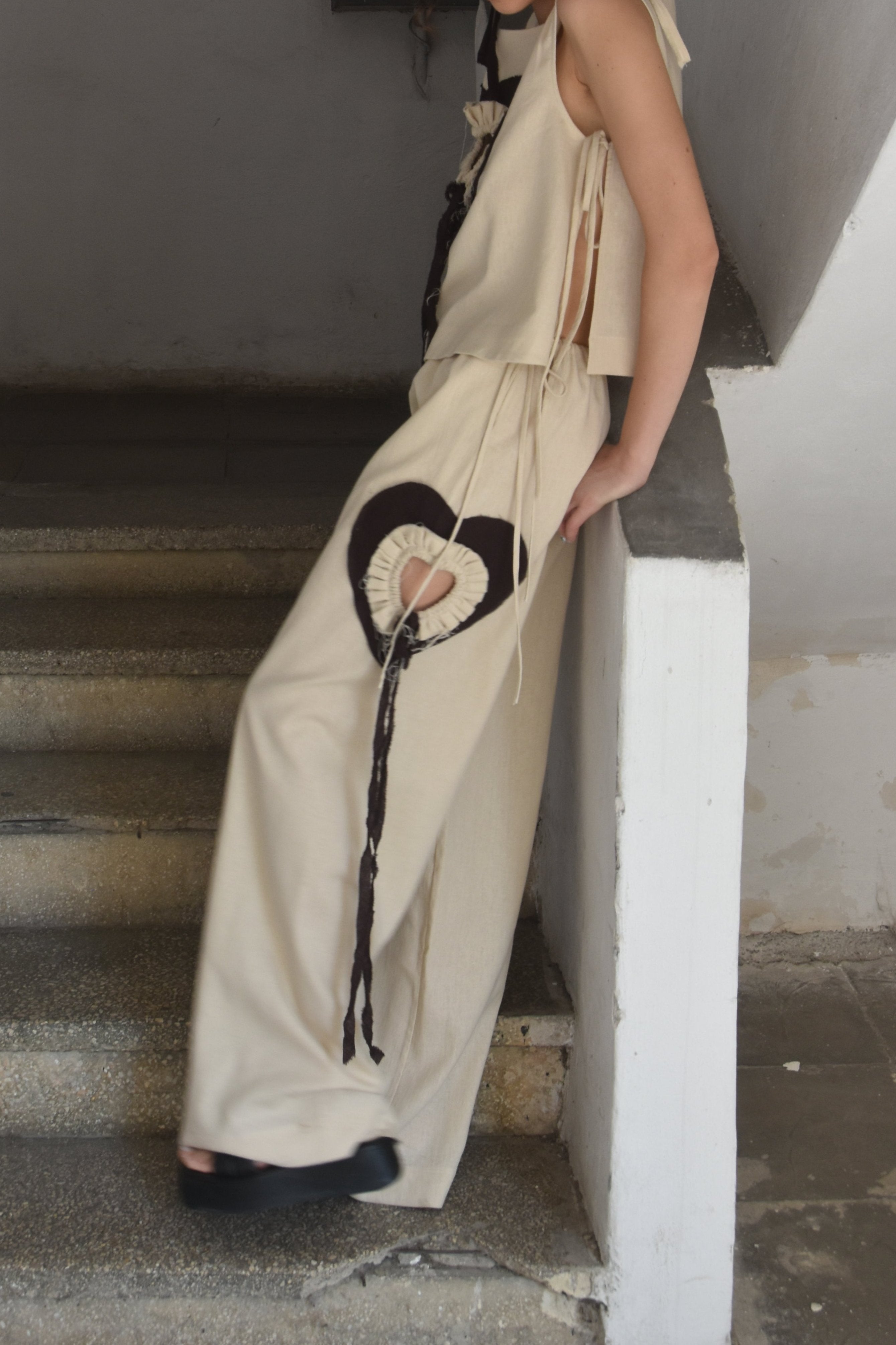 Linen cream wide-leg trousers featuring cut-out brown hearts on the sides, finished with ruffle details for a soft, deconstructed touch.