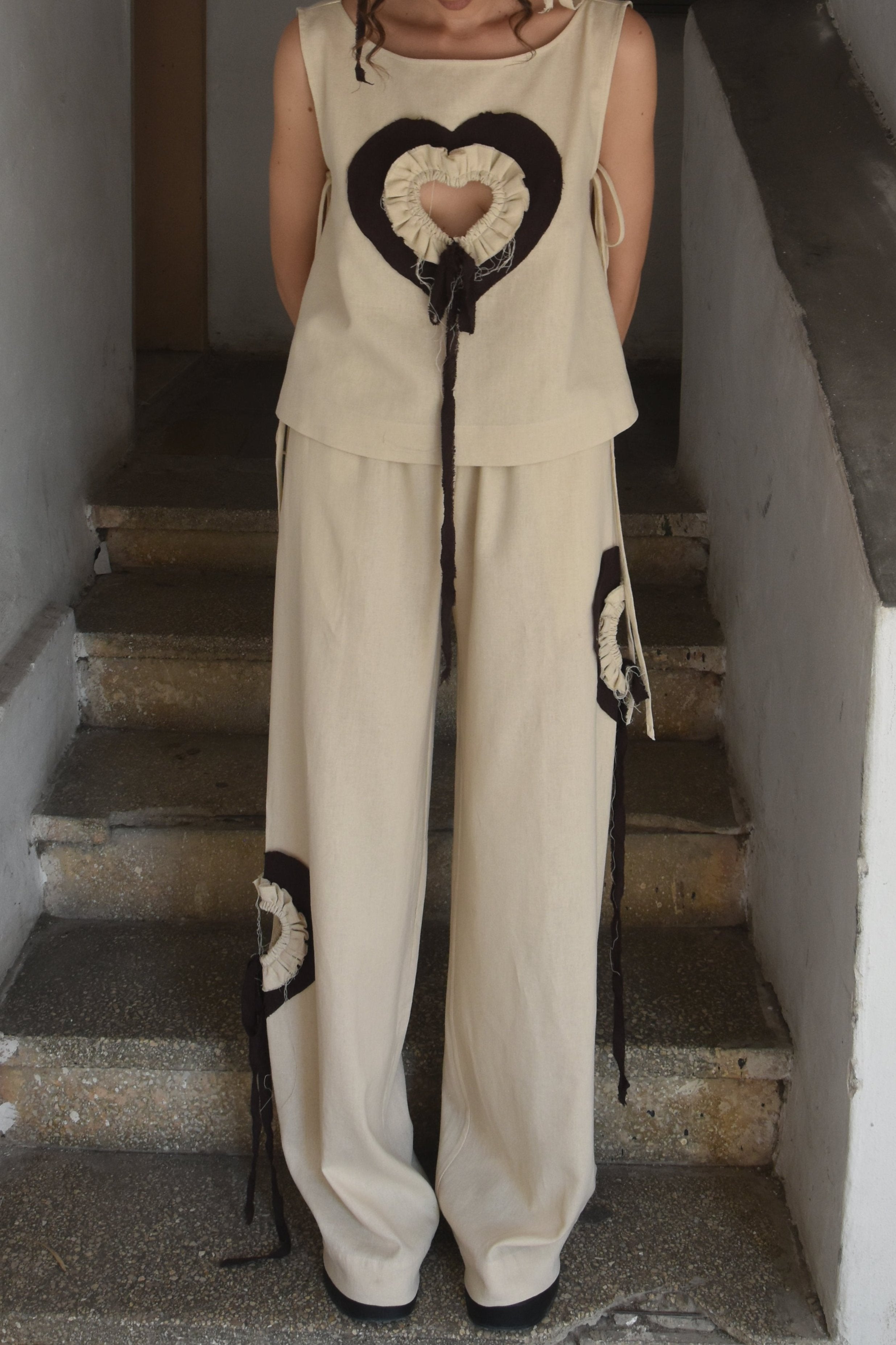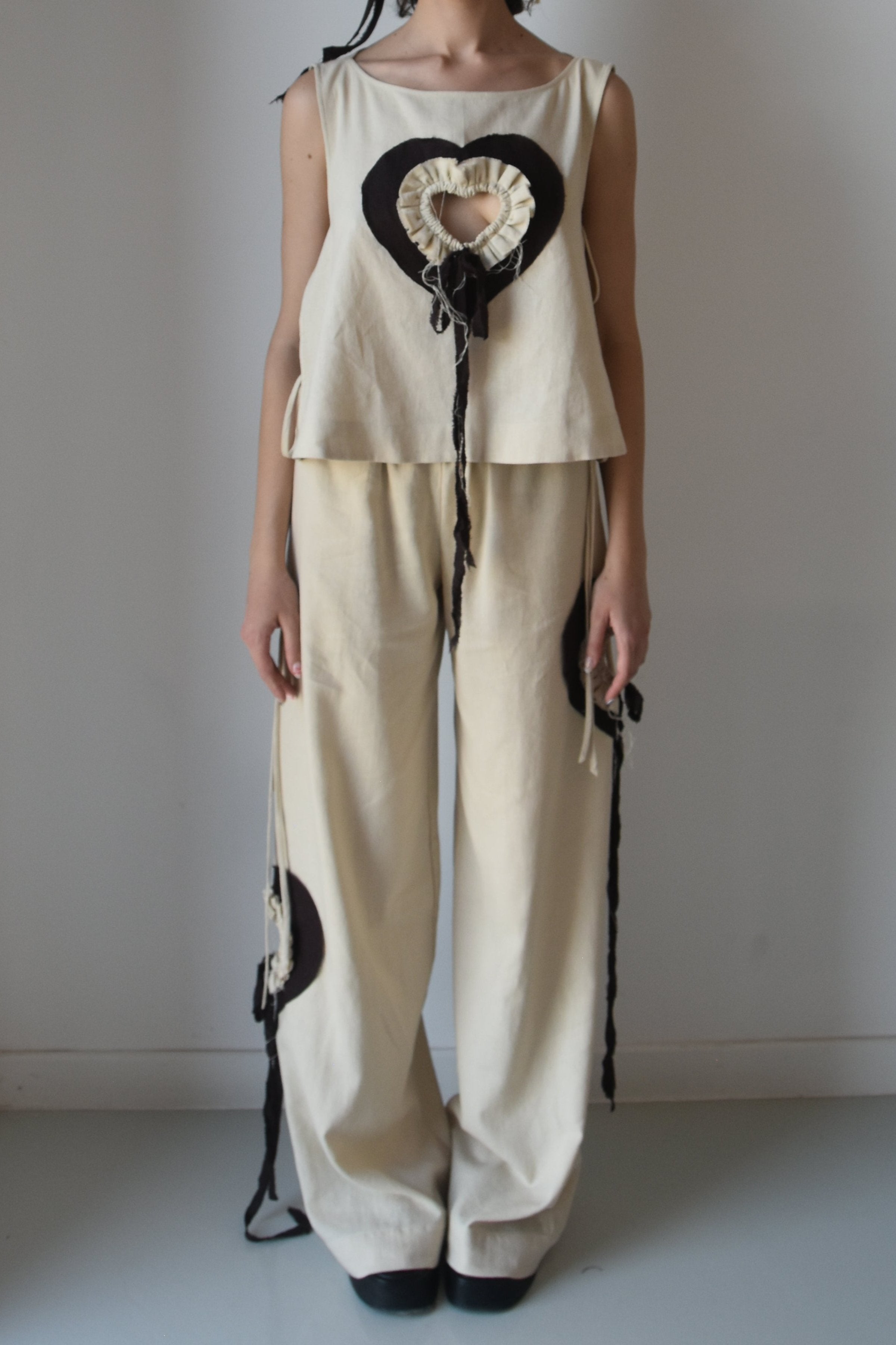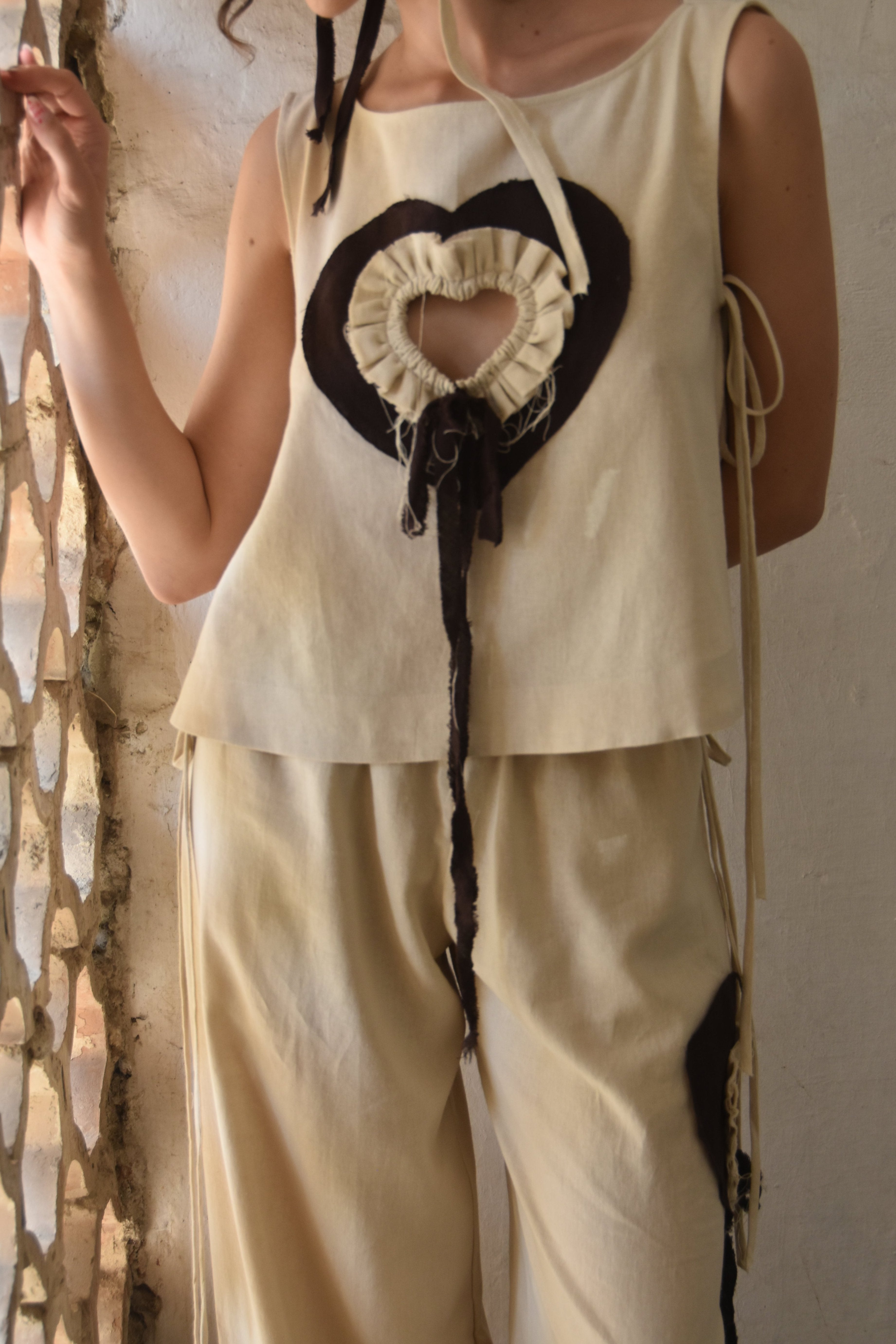 A sleeveless cream top and wide-leg trousers set with cut-out brown hearts and ruffle detailing. The design incorporates asymmetrical threads, lending a playful yet sophisticated look.