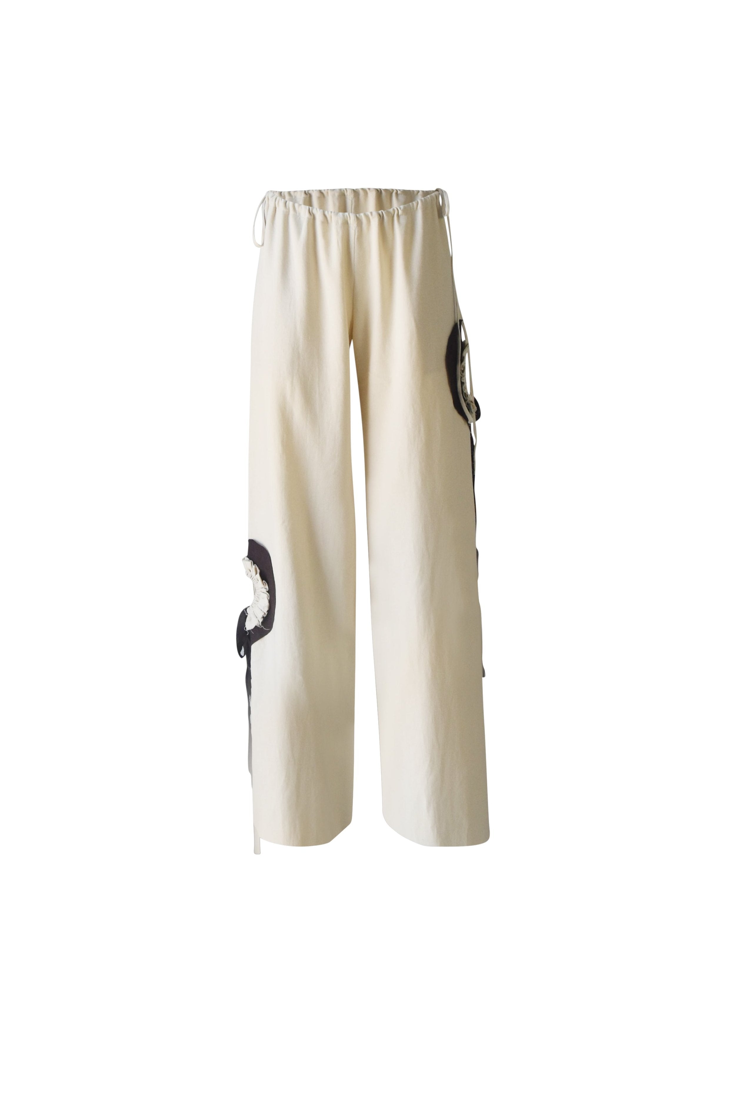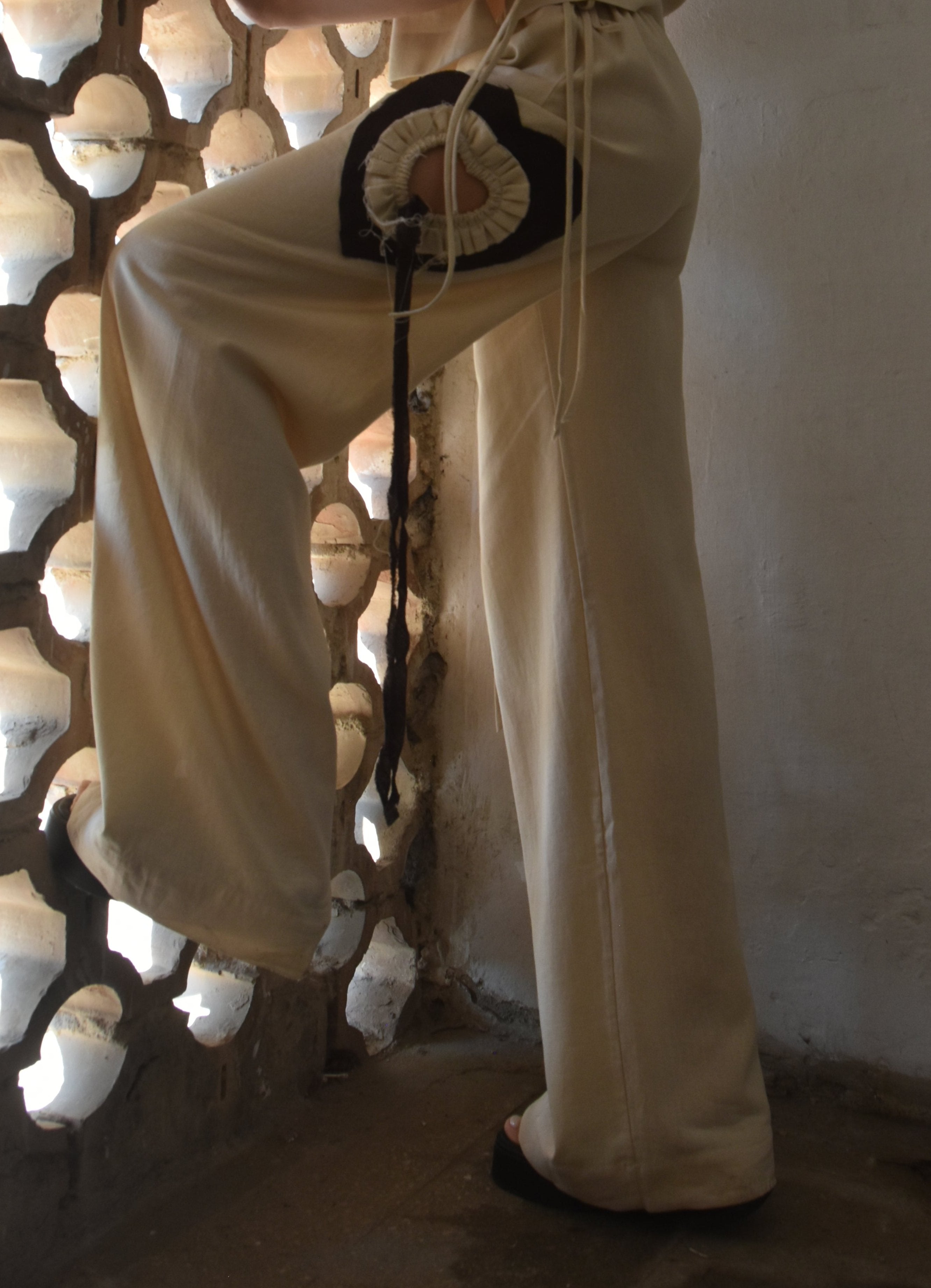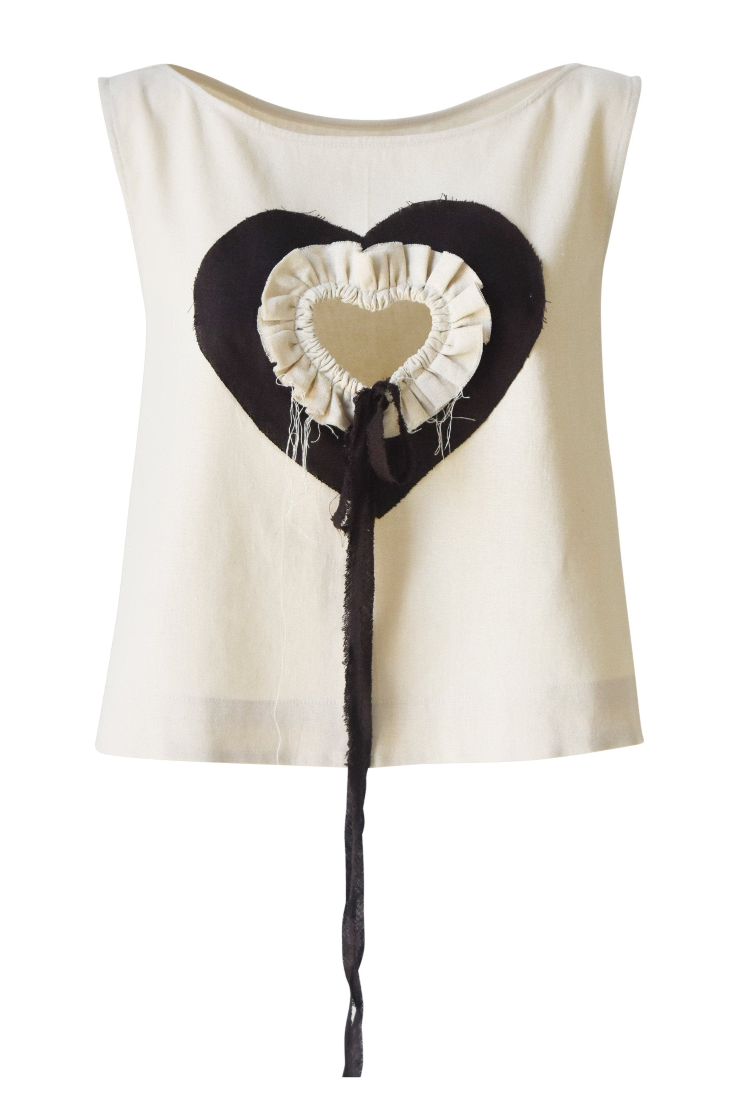 A sleeveless cream top and wide-leg trousers set with cut-out brown hearts and ruffle detailing. The design incorporates asymmetrical threads, lending a playful yet sophisticated look.