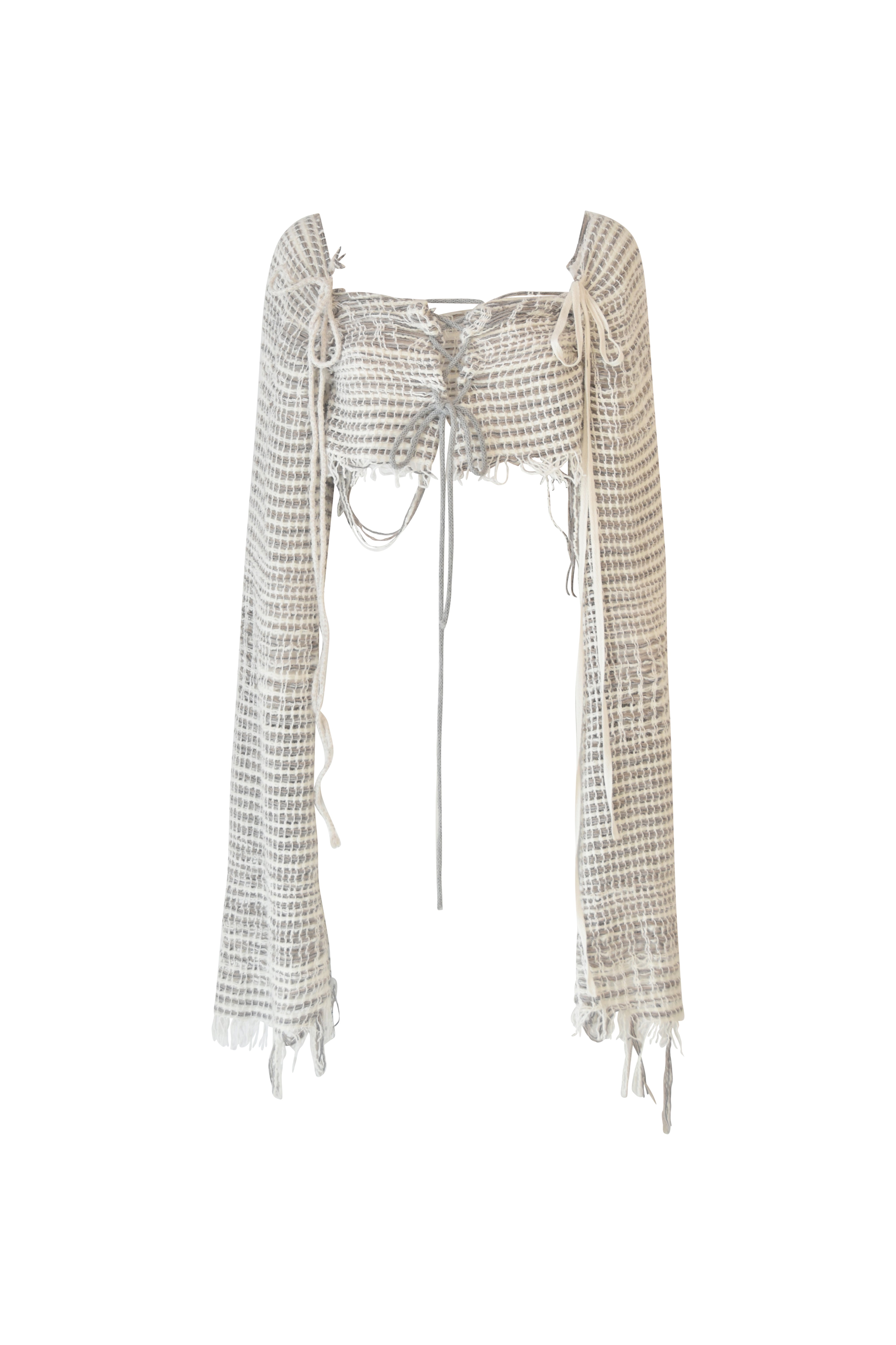 This deconstructed, textured top features adjustable tie straps and long sleeves. The raw edges add a handcrafted, undone aesthetic, giving the piece an artisanal, contemporary feel. Versatile in design, it can be worn alone as a statement piece or layered over other tops for added depth. The piece is reversible, allowing it to be worn with either side as the front. Ideal for pairing with the PETHKU top.