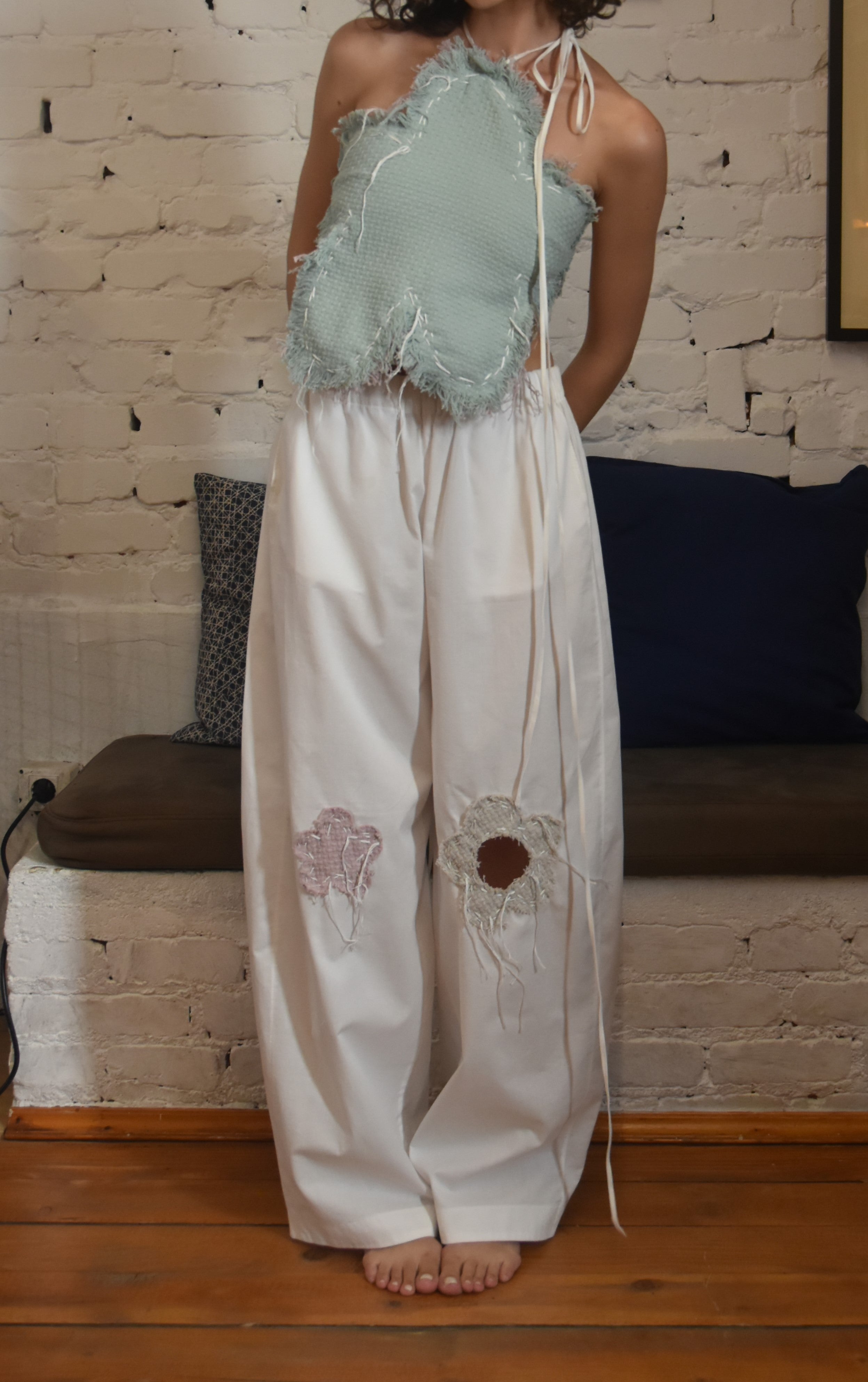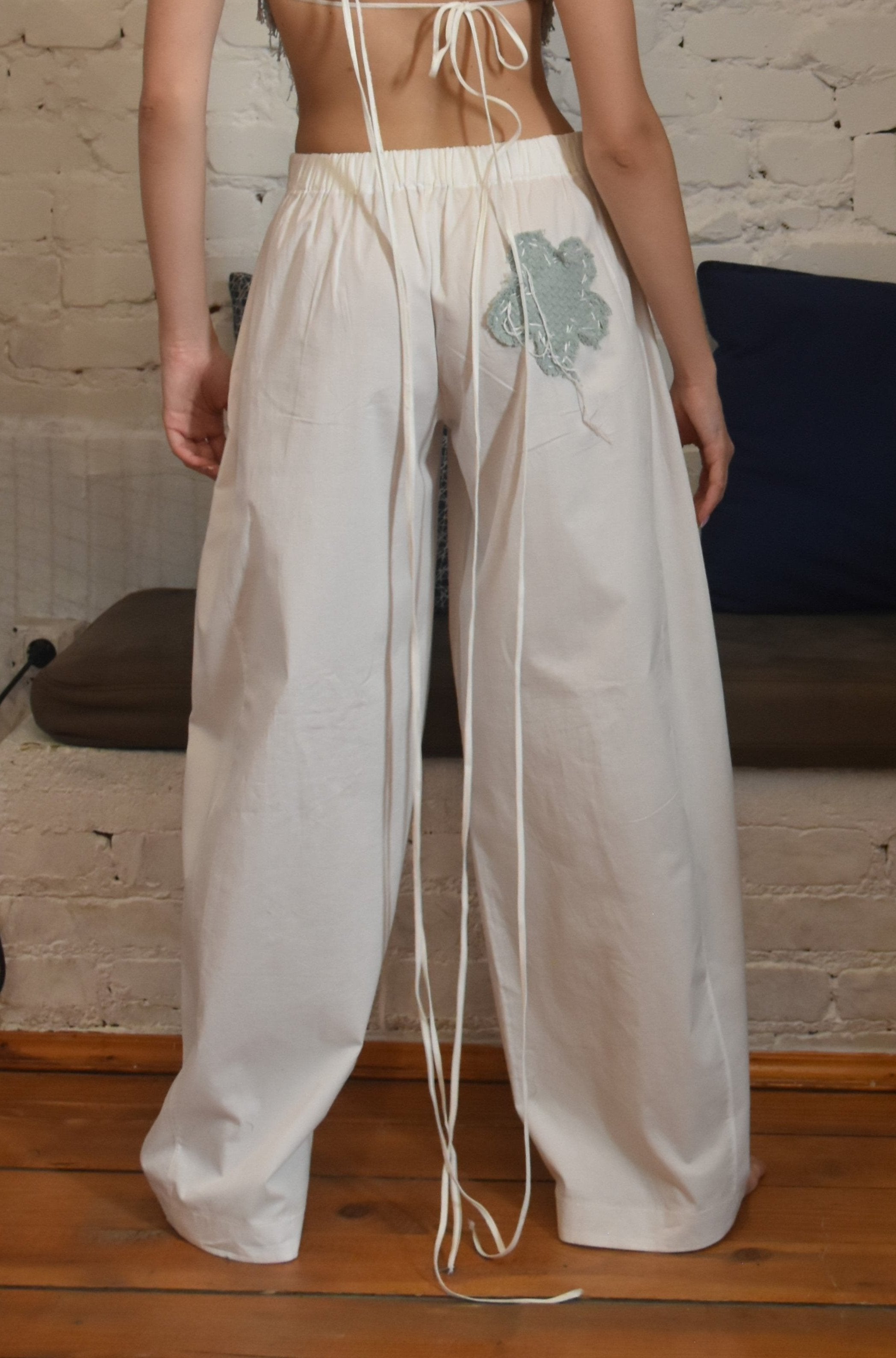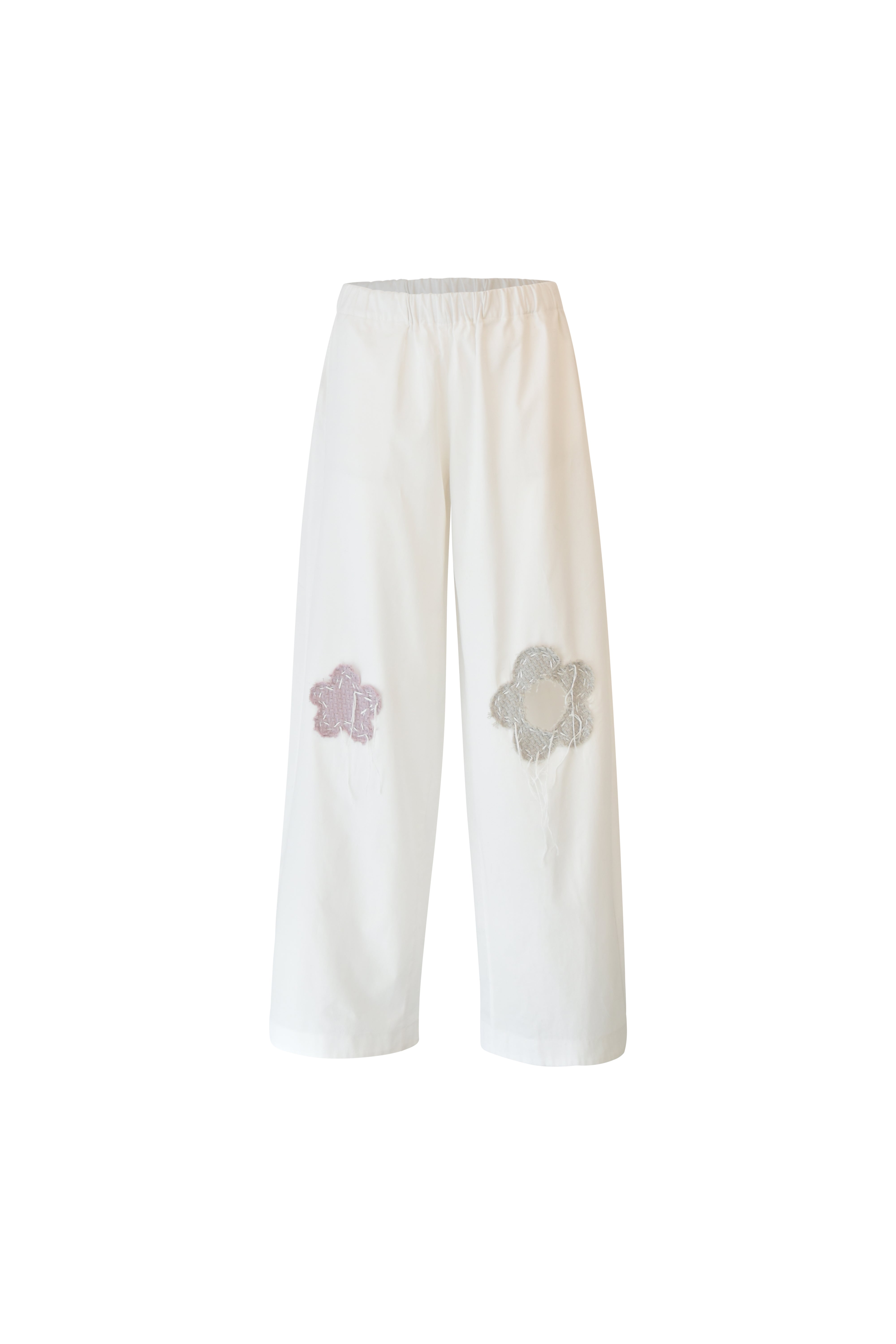 Crafted from 100% cotton, these balloon-fit pants blend comfort with artistry. Designed with an elastic waistband for a relaxed fit, they feature three floral patch details. One knee showcases a unique cut-out flower. All the flower patches are stitched using traditional sashiko technique. These intricate stitches add a handcrafted, textured quality, making these pants an artful addition to any wardrobe. Ideal for those seeking casual wear with a distinctive, artisanal touch.