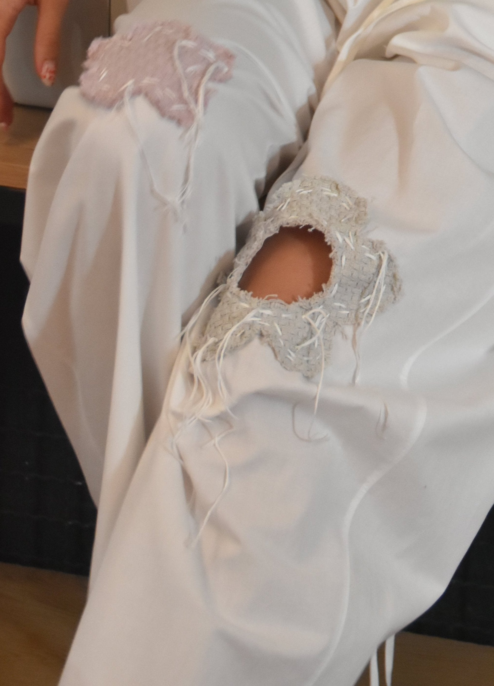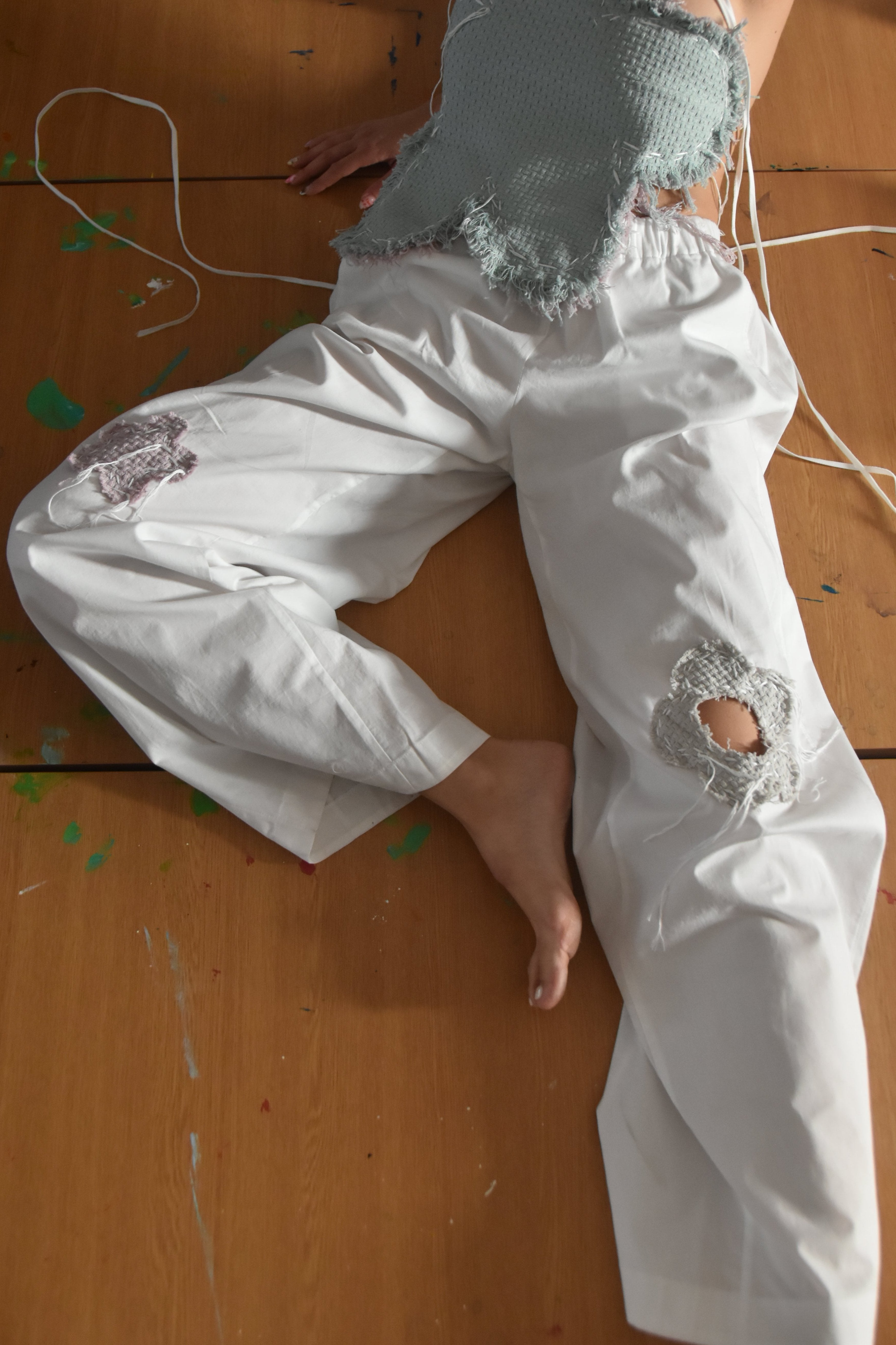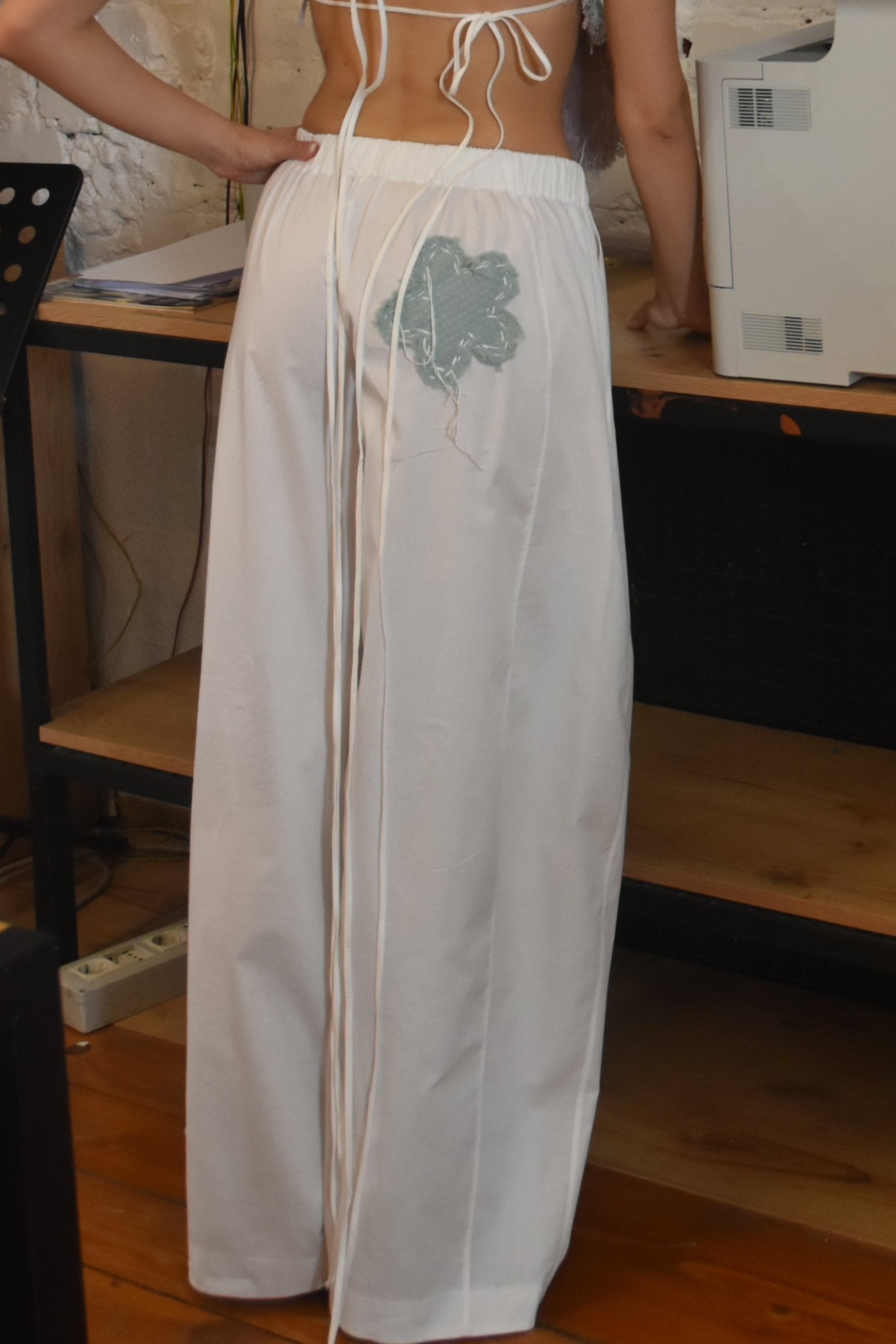 Crafted from 100% cotton, these balloon-fit pants blend comfort with artistry. Designed with an elastic waistband for a relaxed fit, they feature three floral patch details. One knee showcases a unique cut-out flower. All the flower patches are stitched using traditional sashiko technique. These intricate stitches add a handcrafted, textured quality, making these pants an artful addition to any wardrobe. Ideal for those seeking casual wear with a distinctive, artisanal touch.