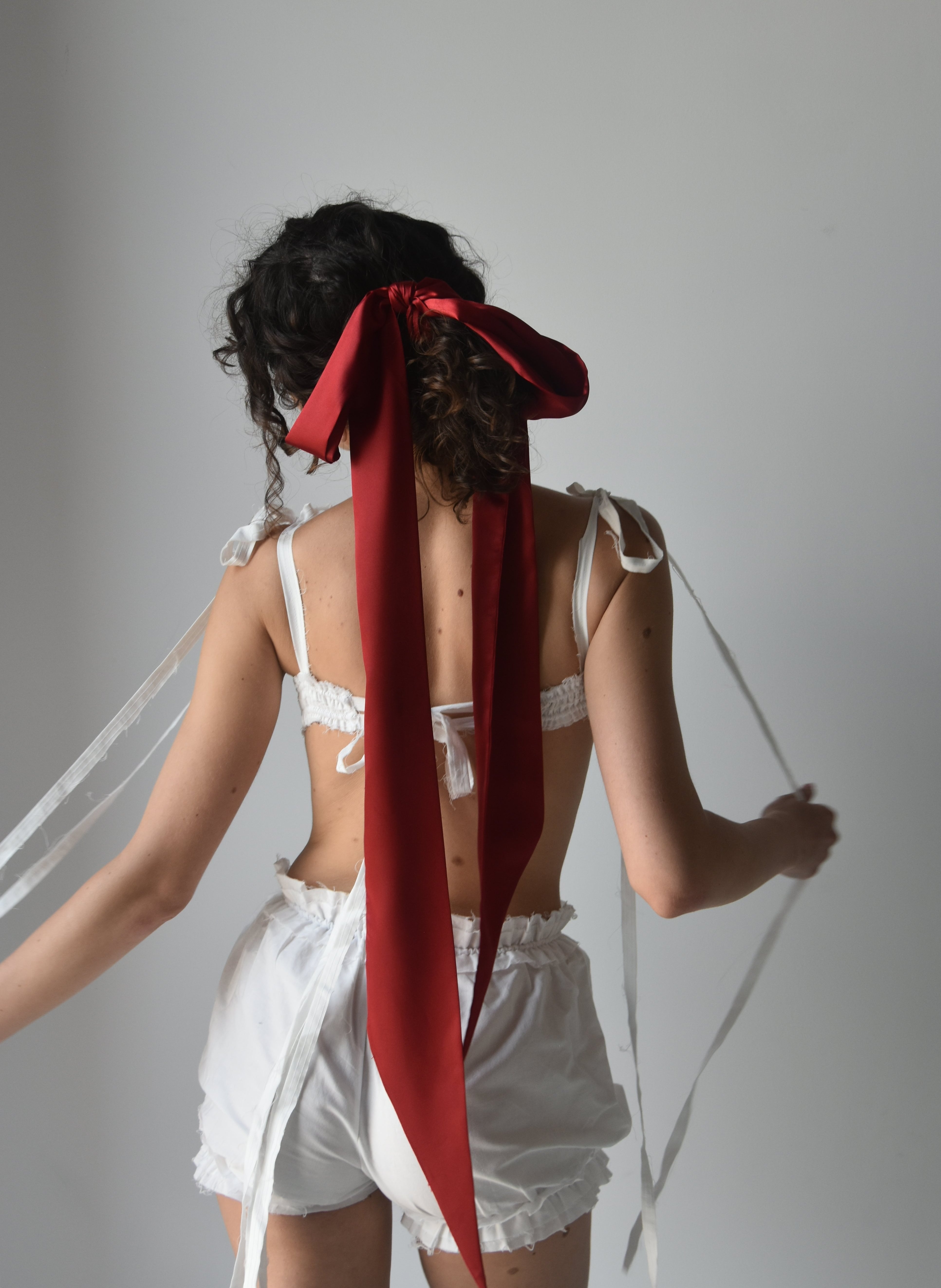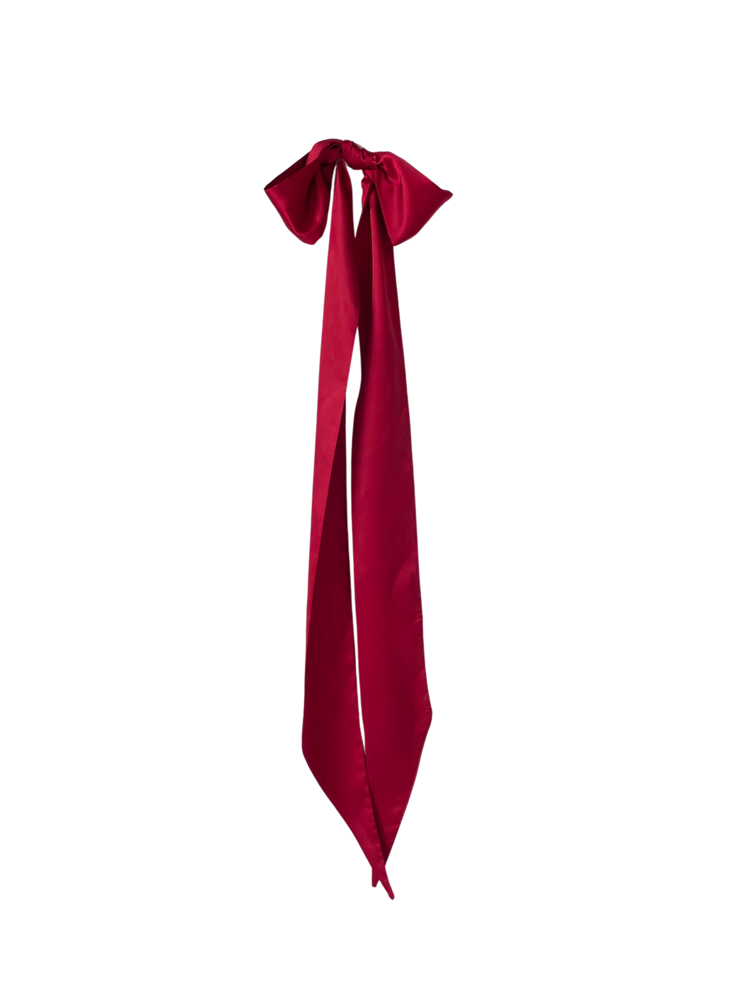 Versatile 100% silk scarf featuring a rich red hue, designed for multifunctional use as a hair ribbon, belt, or classic neck scarf.