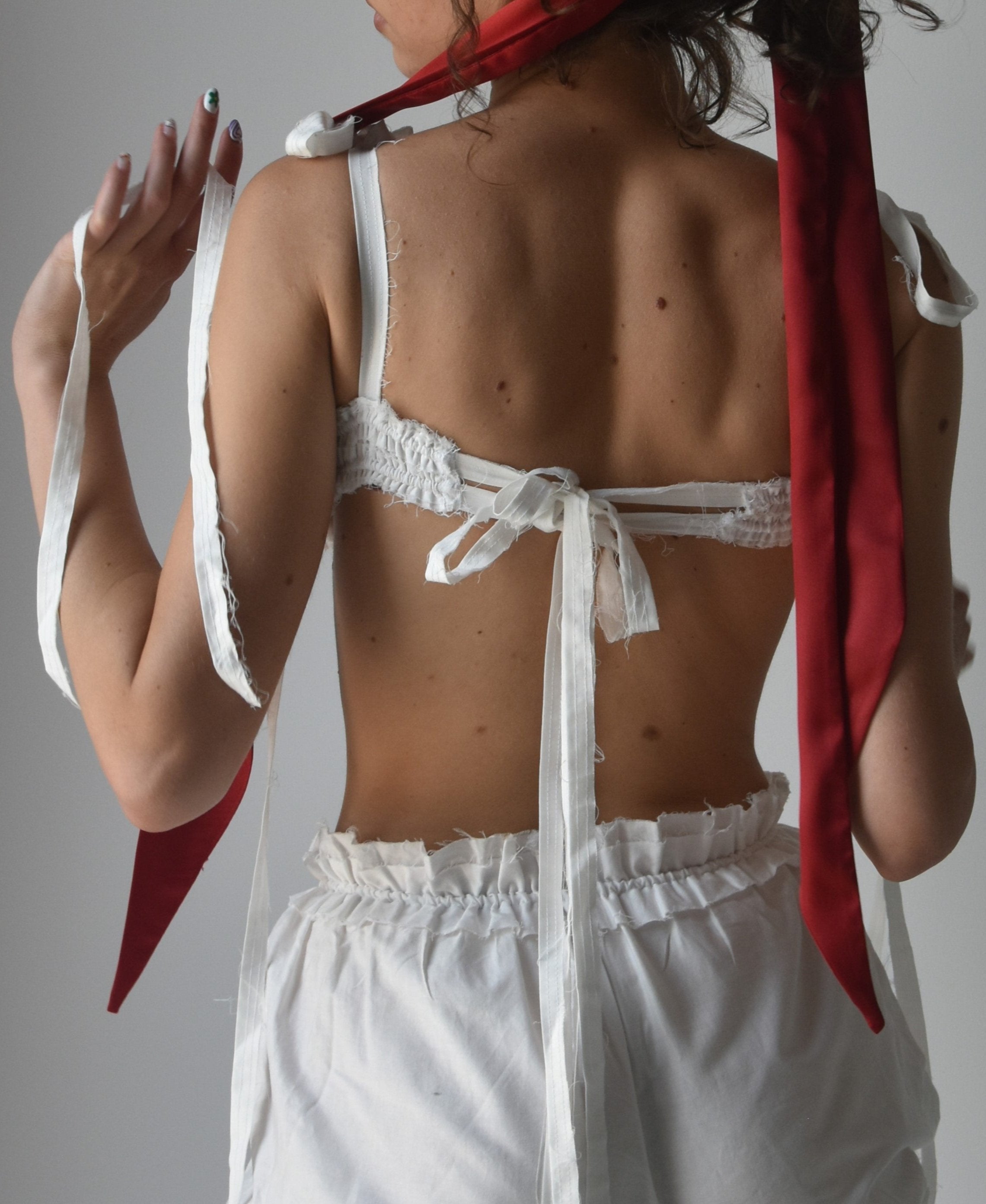 This lightweight 100% cotton top features adjustable, multi-way ties for versatile styling. It can be worn as a statement piece or used as an underlayer for other tops or dresses, adding a delicate and functional touch to layered looks. Perfect for pairing with high-waisted bottoms or as a base for more complex outfits.