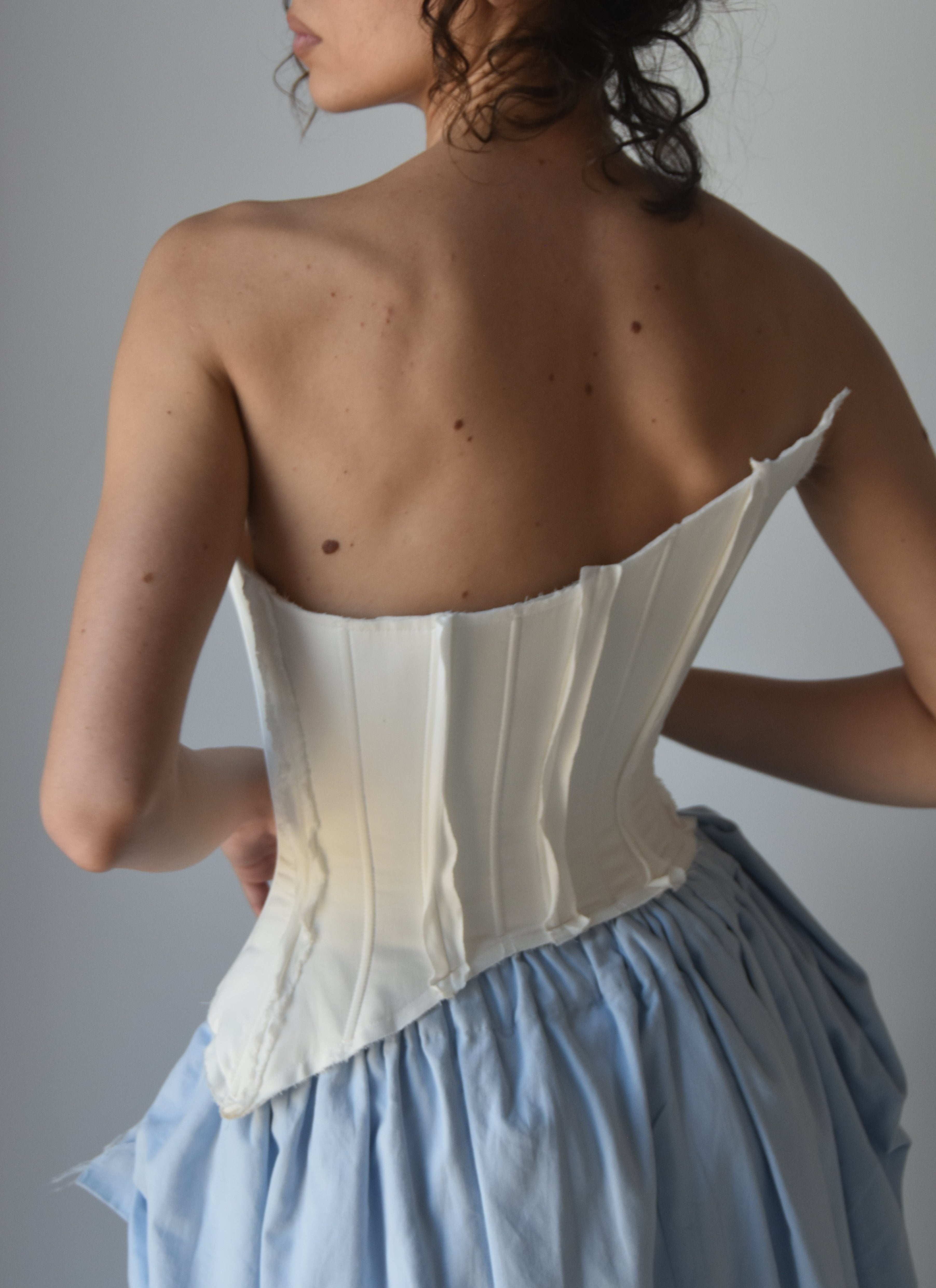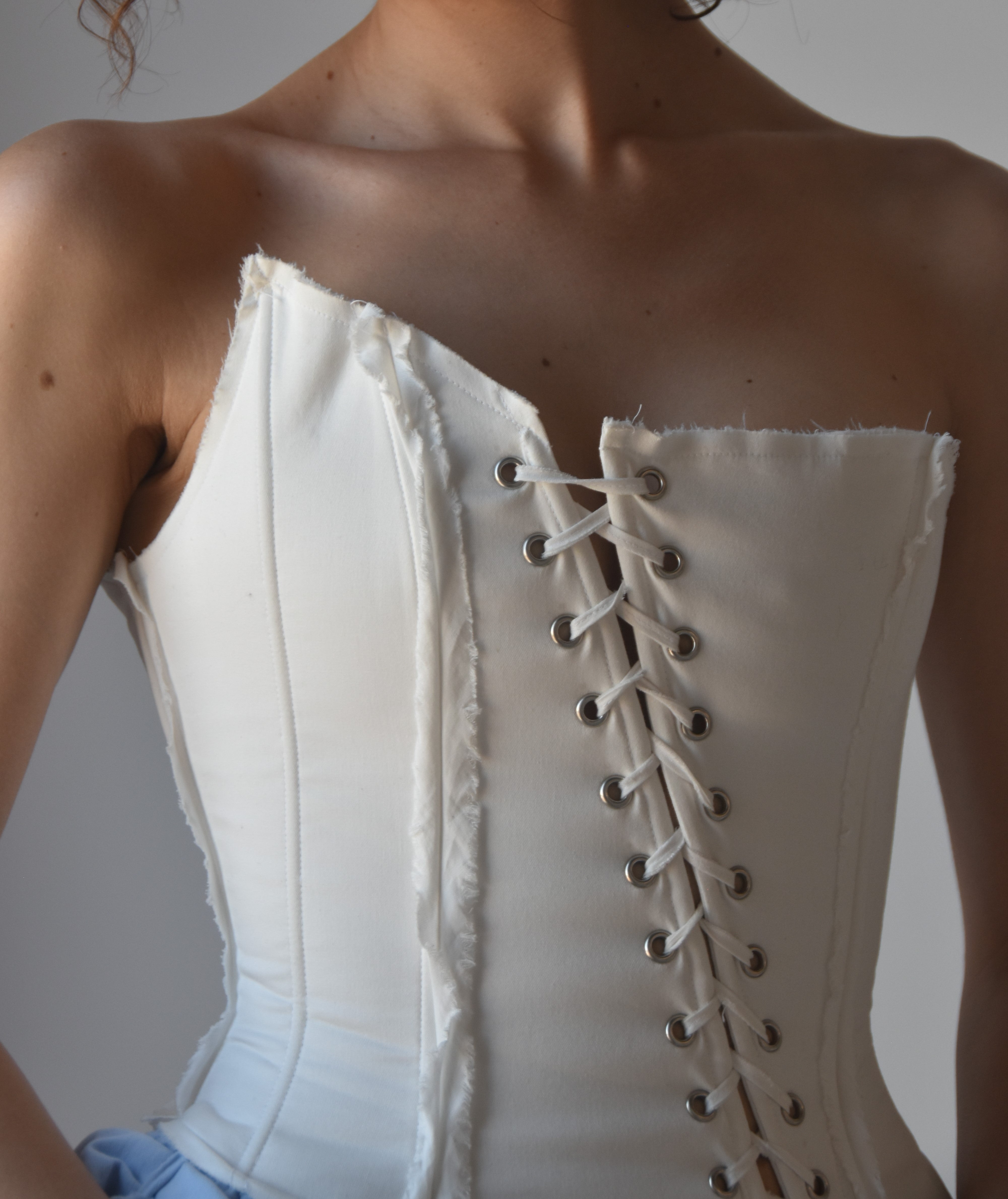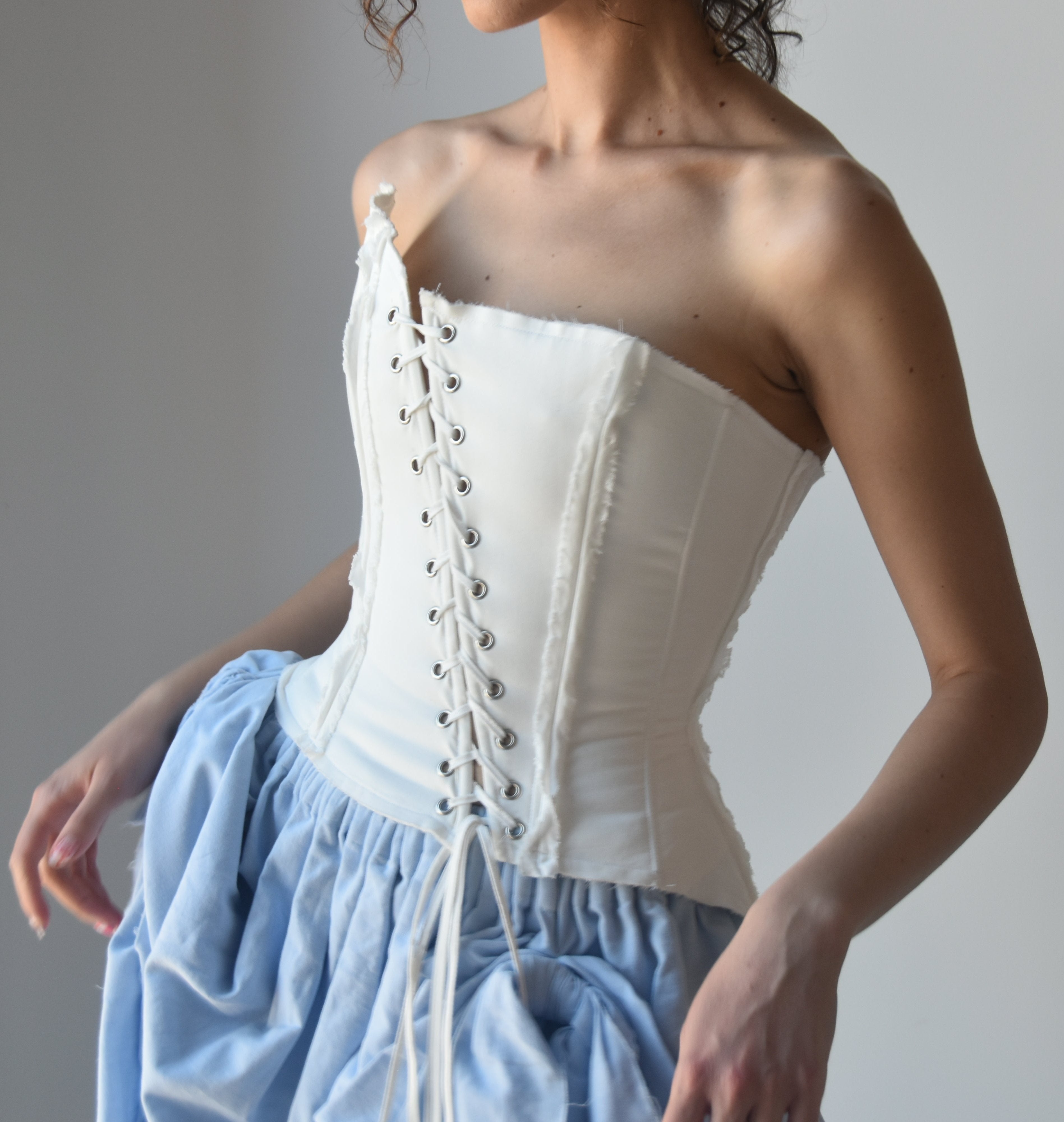 This is a 100% cotton corset with structured boning, an asymmetrical cut, and a front lace-up closure. Unfinished edges add a deconstructed look, giving it a raw, edgy aesthetic.