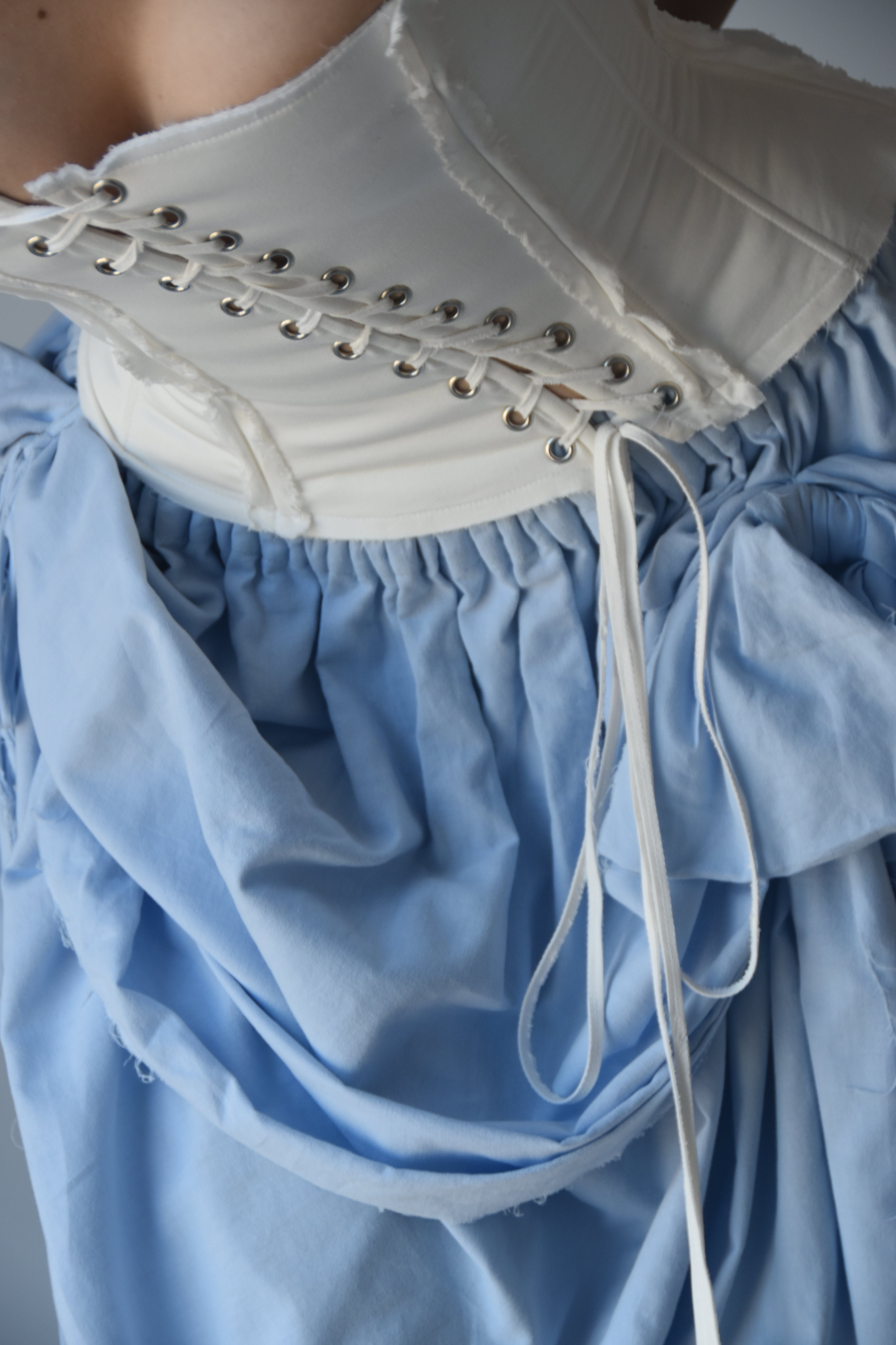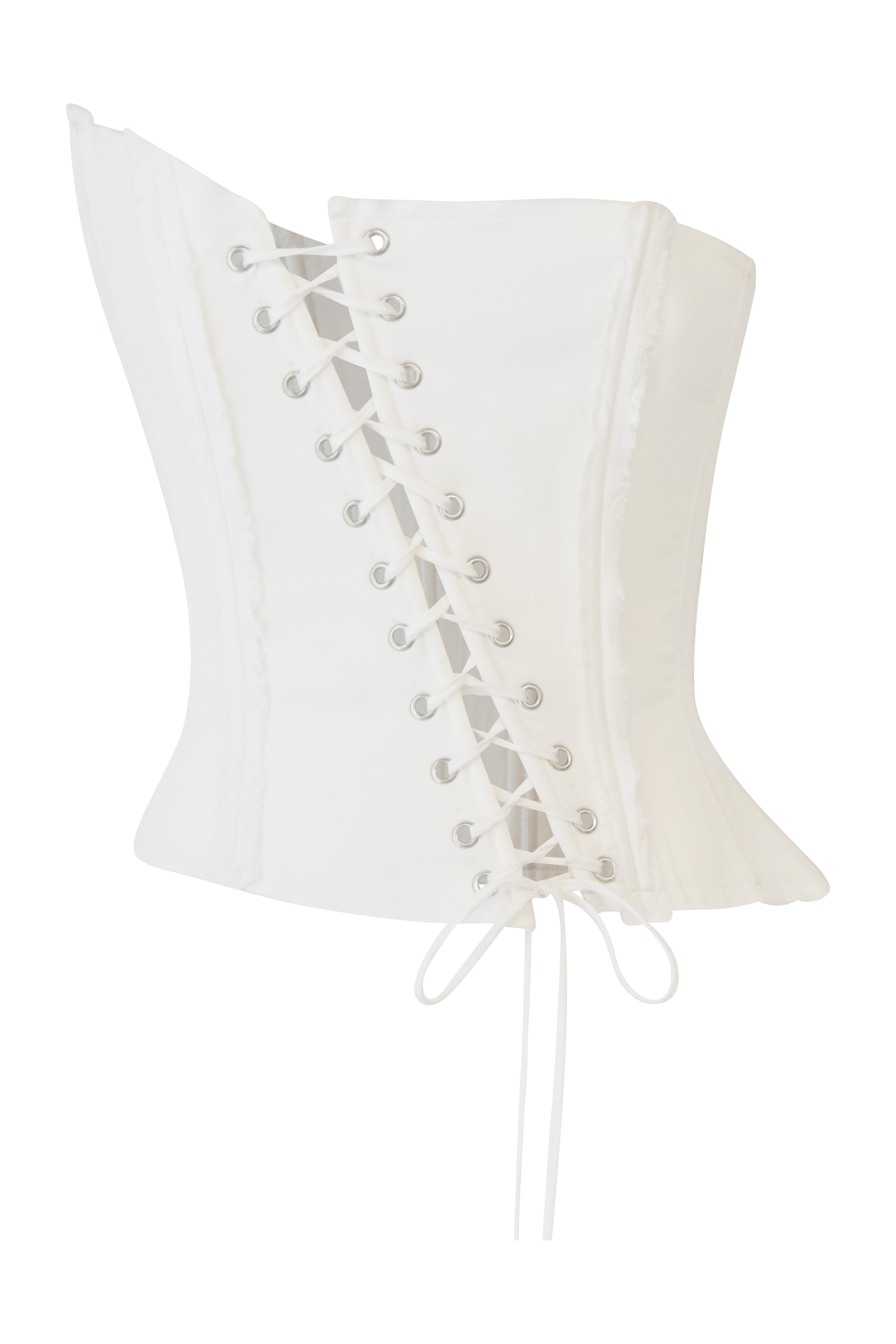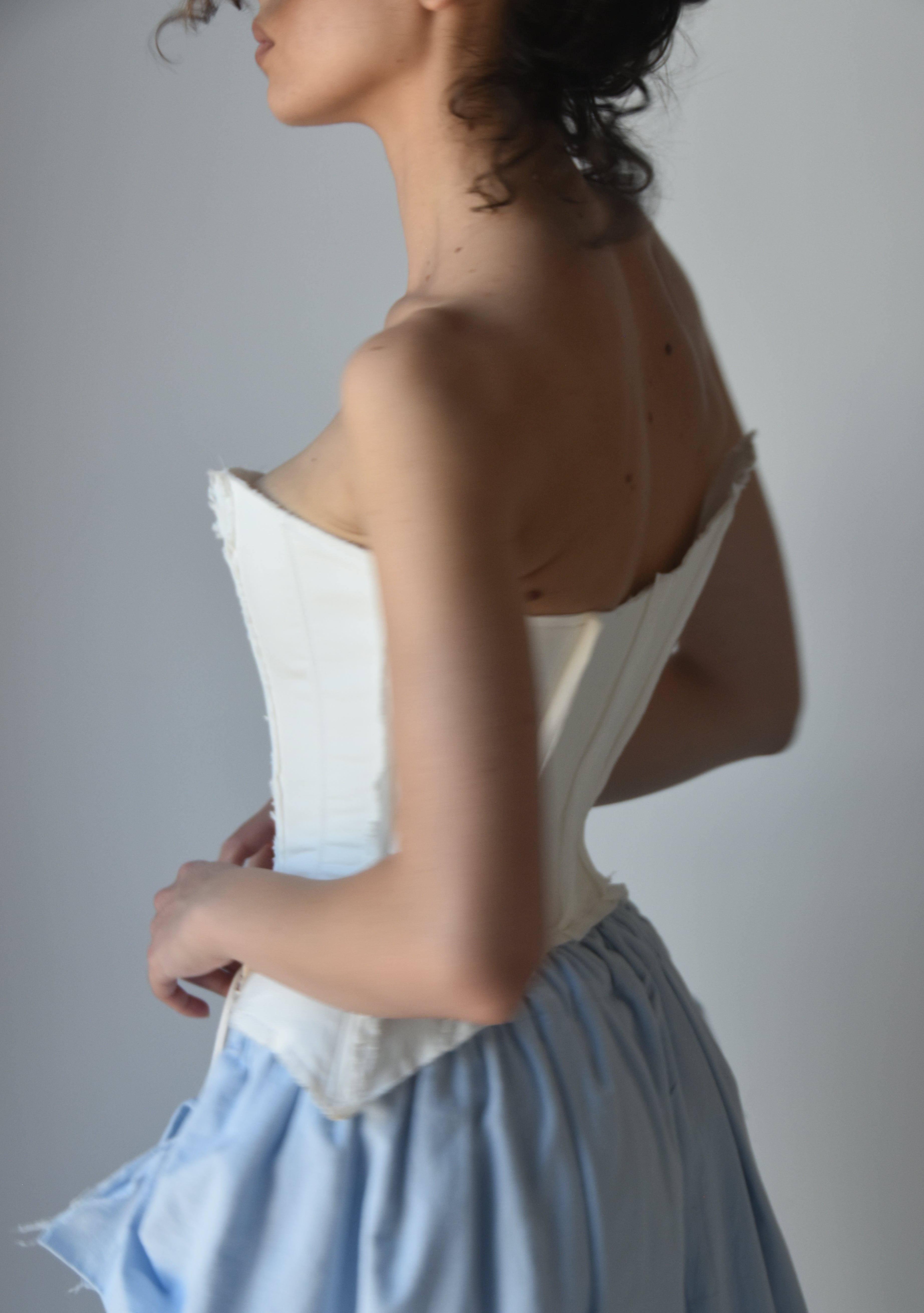This is a 100% cotton corset with structured boning, an asymmetrical cut, and a front lace-up closure. Unfinished edges add a deconstructed look, giving it a raw, edgy aesthetic.
